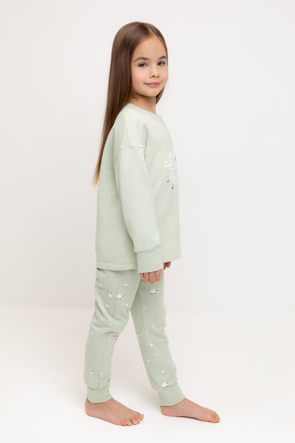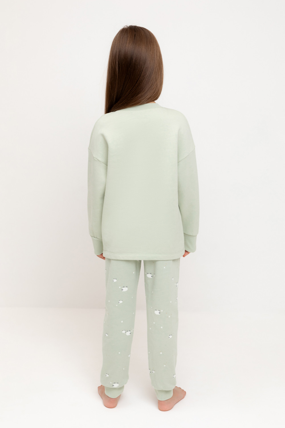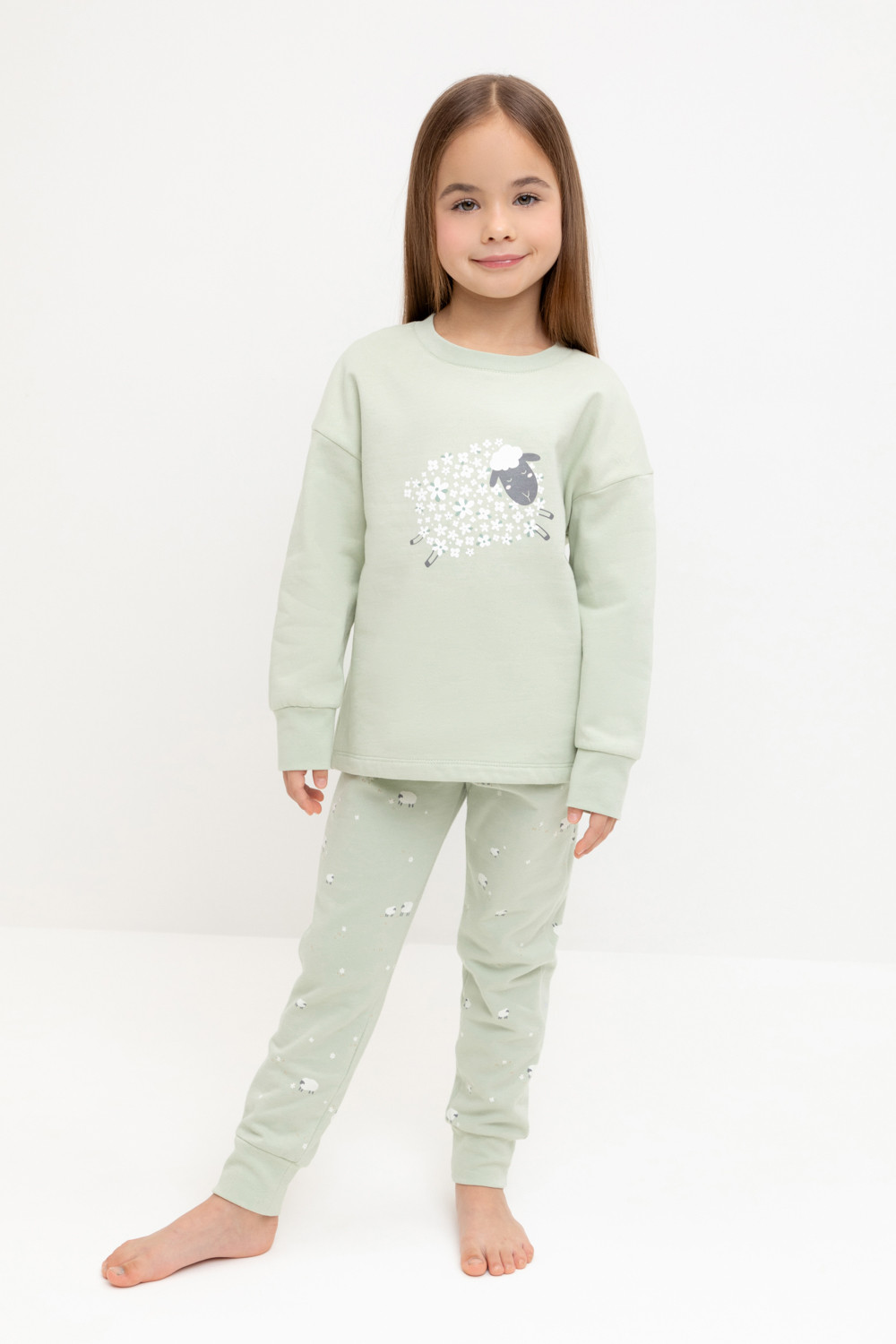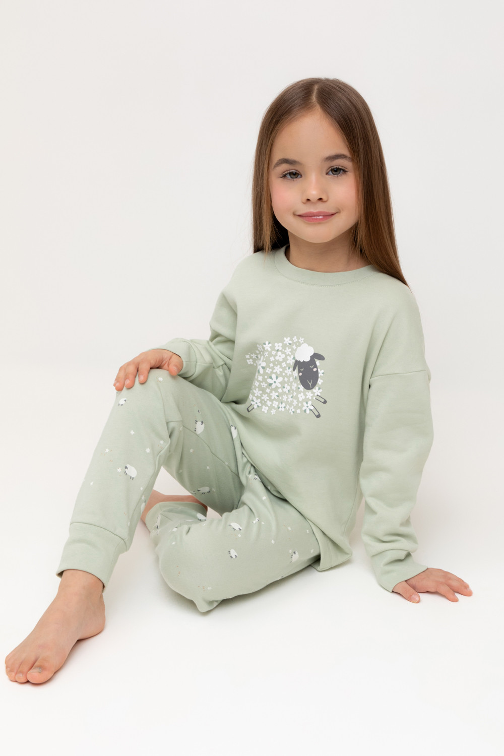 Трикотажная пижама с начёсом из натурального хлопка. Джемпер с длинными спущенными рукавами и брюки с эластичной резинкой в поясе. Мягкие манжеты на рукавах и по низу брюк. Оригинальные набивка и принт выполнены из стойких гипоаллергенных текстильных гипоаллергенных красителей. Изделие сохраняет цвет и форму после многократных стирок. Все трикотажные полотна производятся в соответсвии с нормами швейцарского сертификата ЭкоТекс.