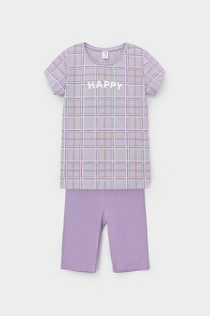 Трикотажная пижама из натурального хлопка. Удлиненная футболка с оригинальным принтом и спущенной линией плеч. У бридж в комплекте мягкий, эластичный пояс на резинке. Оригинальная набивка выполнена из стойких, гипоаллергенных текстильных красителей. Комплект сохраняет цвет и форму после многократных стирок. Все трикотажные полотна производятся в соответсвии с нормами Швейцарского сертификата ЭкоТекс.