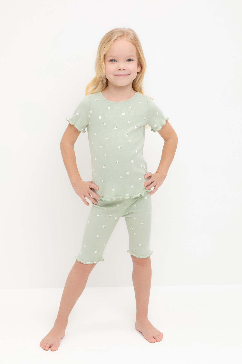 Трикотажная пижама в рубчик из натурального хлопка. Футболка с короткими втачными рукавами и шорты с эластичной резинкой в поясе. Оригинальная набивка выполнена из стойких текстильных гипоаллергенных красителей. Изделие сохраняет цвет и форму после многократных стирок. Все трикотажные полотна производятся в соответсвии с нормами швейцарского сертификата ЭкоТекс.