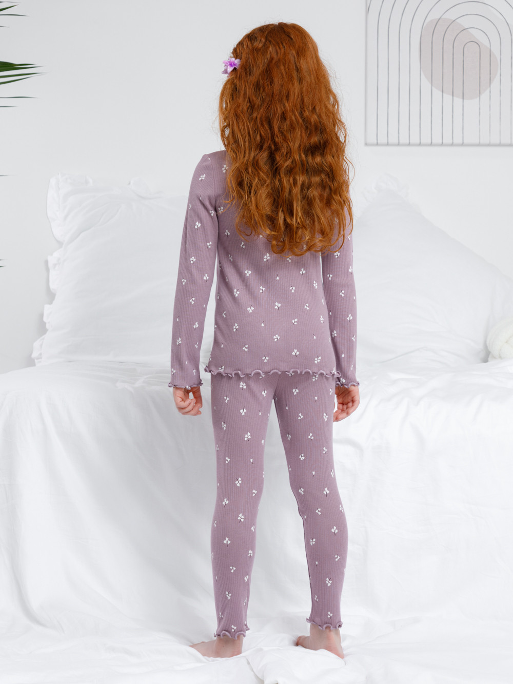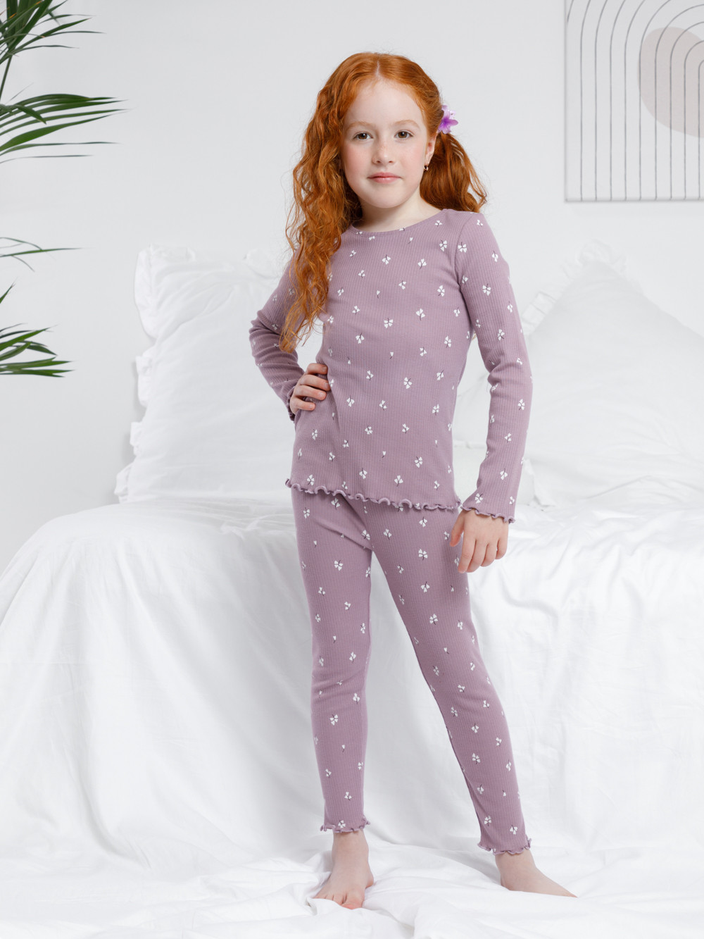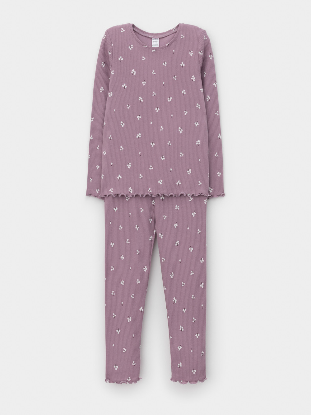 Трикотажная пижама в рубчик из натурального хлопка. Джемпер с длинными втачными рукавами и лосины с эластичной резинкой в поясе. Оригинальная набивка выполнена из стойких текстильных гипоаллергенных красителей. Изделие сохраняет цвет и форму после многократных стирок. Все трикотажные полотна производятся в соответствии с нормами швейцарского сертификата ЭкоТекс.