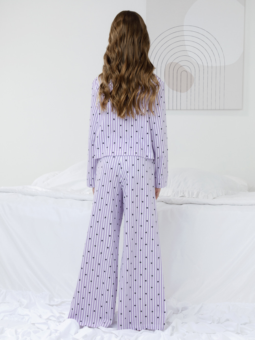 Трикотажная пижама из натурального хлопка для комфортного сна и отдыха. Рубашка на пуговицах с длинными рукавами и широкие брюки с мягкой эластичной резинкой в поясе. Набивной рисунок выполнен из стойких текстильных гипоаллергенных красителей. Изделие сохраняет цвет и форму после многократных стирок. Все трикотажные полотна производятся в соответствии с нормами швейцарского сертификата ЭкоТекс.