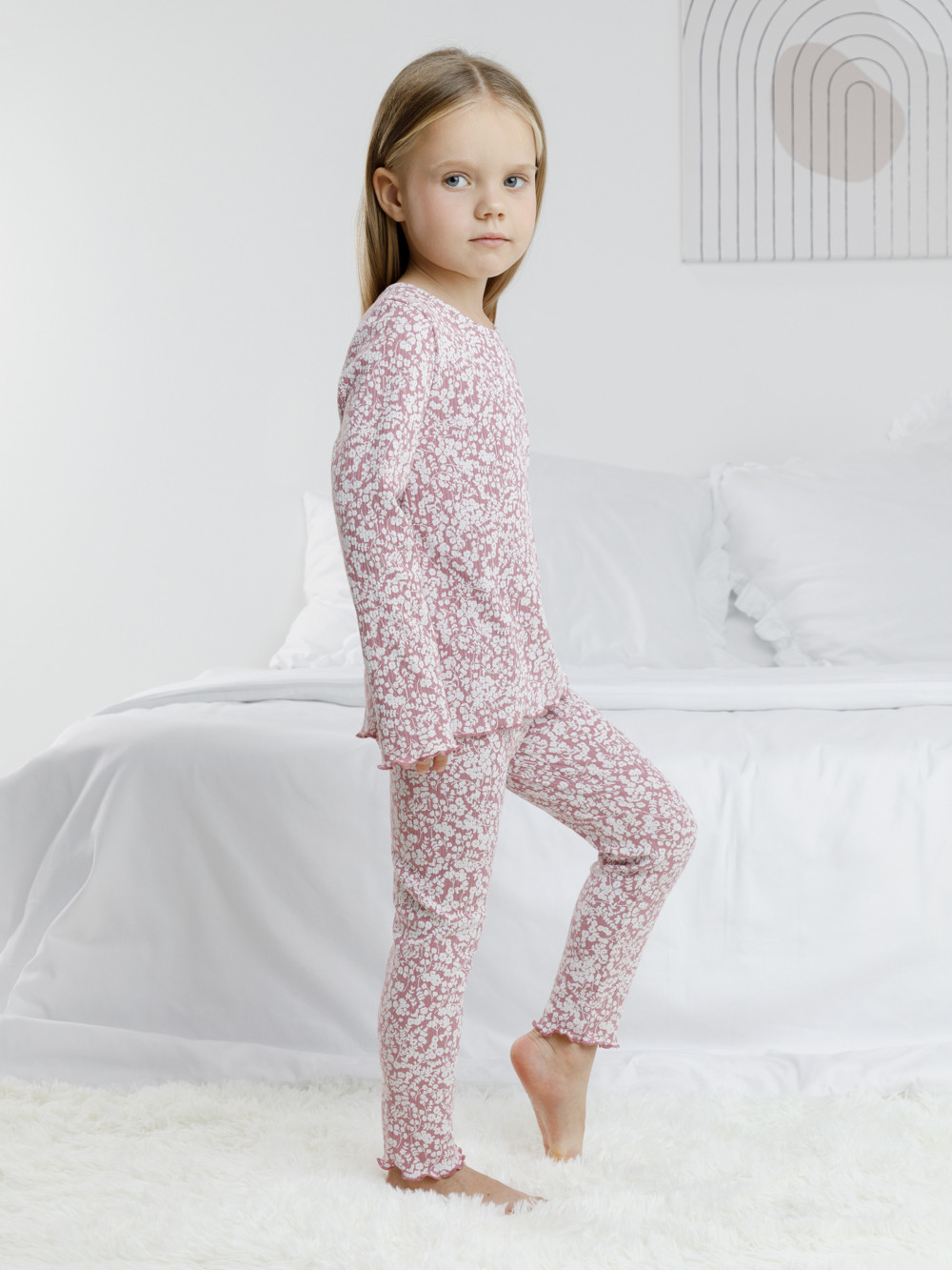 Трикотажная пижама в рубчик из натурального хлопка. Джемпер с длинными втачными рукавами и лосины с эластичной резинкой в поясе. Оригинальная набивка выполнена из стойких текстильных гипоаллергенных красителей. Изделие сохраняет цвет и форму после многократных стирок. Все трикотажные полотна производятся в соответствии с нормами швейцарского сертификата ЭкоТекс.