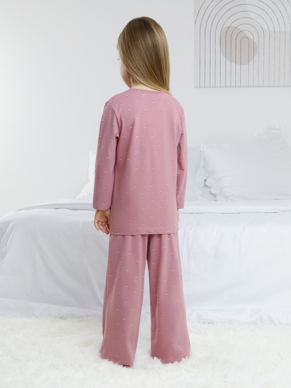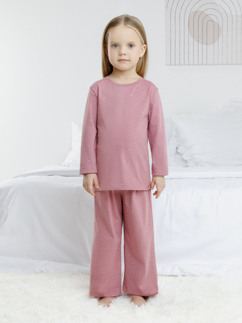 Пижама для девочки из натурального хлопка. Джемпер с длинными втачными рукавами и прямые брюки с эластичной резинкой в поясе. Оригинальная набивка выполнена из стойких текстильных гипоаллергенных красителей. Изделие сохраняет цвет и форму после многократных стирок. Все трикотажные полотна производятся в соответствии с нормами швейцарского сертификата ЭкоТекс.