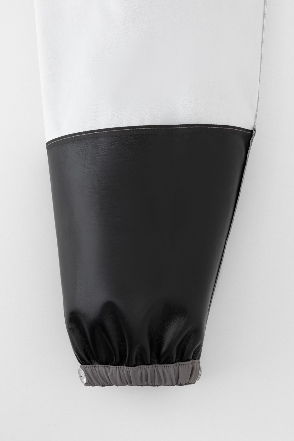 Полукомбинезон без подкладки, непромокаемый, на эластичных бретелях с регулировкой длины при помощи фастекса, сбоку под проймой кнопки для регулировки объема, низ брючин с эластичной резинкой. Для фиксации полукомбинезона используются съемные силиконовые штрипки. Светоотражающий принт в виде полосы сбоку.