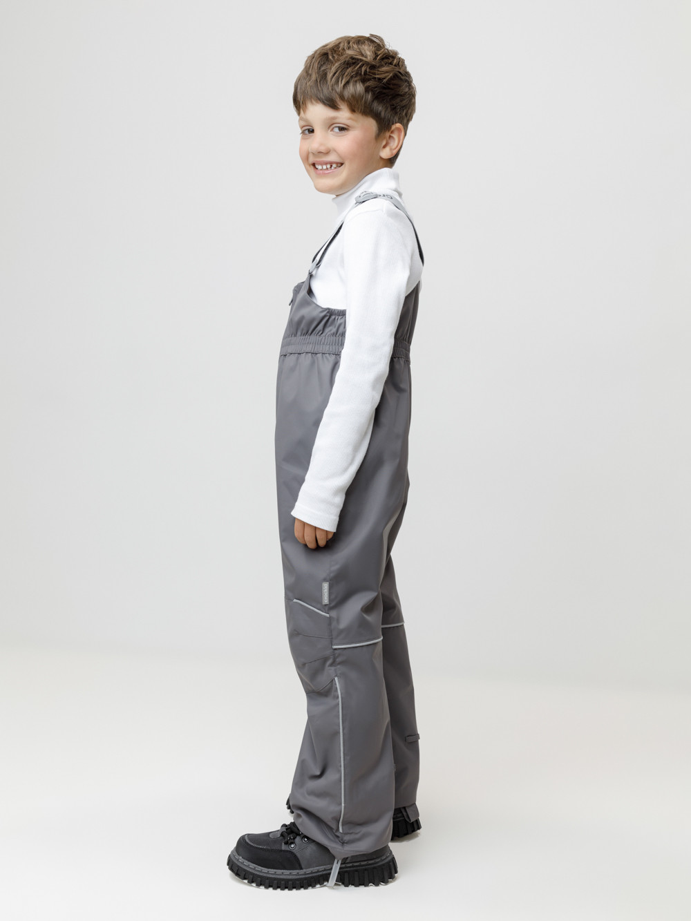Демисезонный полукомбинезон детский с утеплителем 60 г/м2. Выполнен из мембранной ткани с дополнительной тефлоновой обработкой. Данный вид обработки предохраняет изделие от загрязнения и лучше отводит влагу. Подклад из 100% полиэстера. Эластичные лямки для удобства регулируются по длине. Область коленей дополнительно усилена деталями из основной ткани. Низ регулируется по длине при помощи липучки. Для фиксации полукомбинезона используются съёмные силиконовые штрипки. Во всех изделиях верхнего ассортимента для безопасности ребёнка предусмотрены светоотражающие элементы.