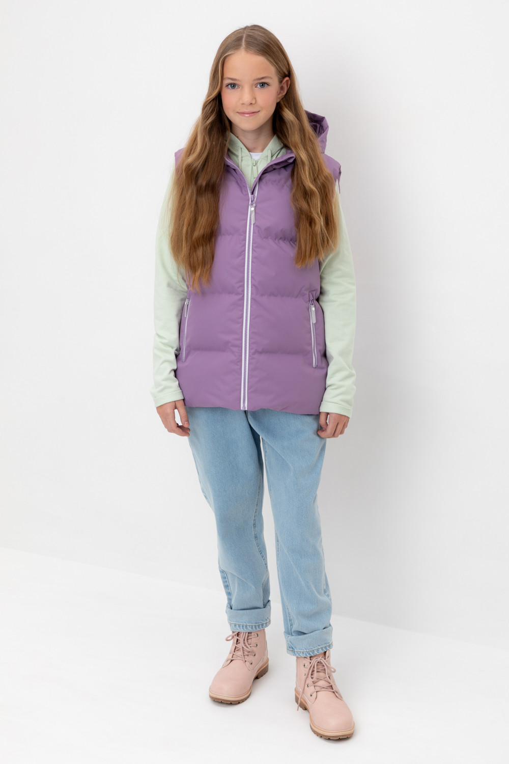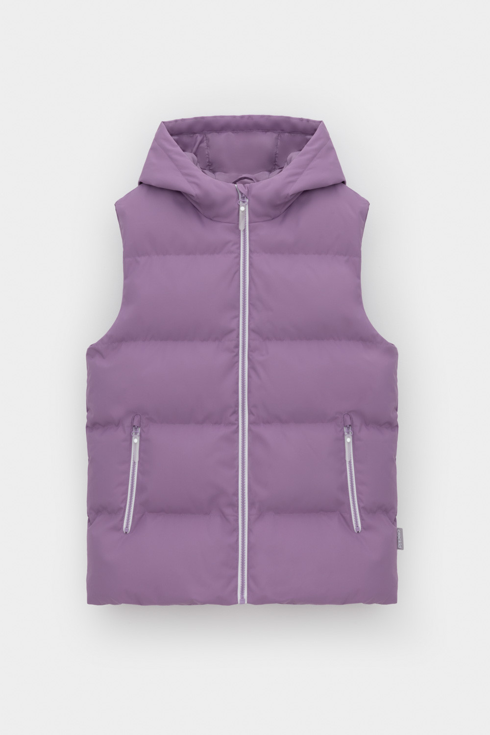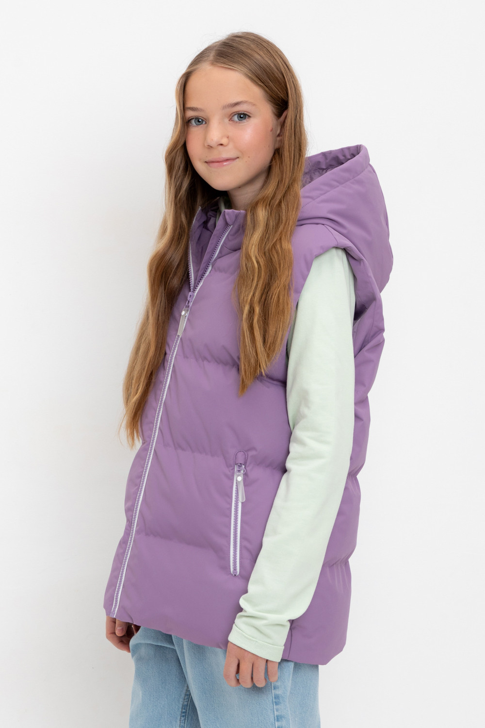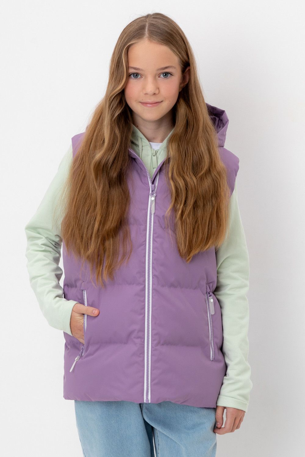 Стеганый жилет с капюшоном для девочки с утеплителем Fellex®: 120 г/м2. Выполнен из мембранной ткани с дополнительной тефлоновой обработкой. Данный вид обработки предохраняет изделие от загрязнения и лучше отводит влагу. Подклад из 100% полиэстра. Капюшон не снимается. Изделие застёгивается на молнию, предусмотрена защита подбородка. Два кармана по бокам застёгиваются на молнии. Во всех изделиях верхнего ассортимента для безопасности ребенка предусмотрены светоотражающие элементы.