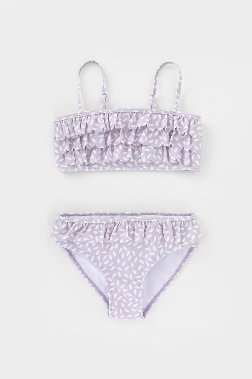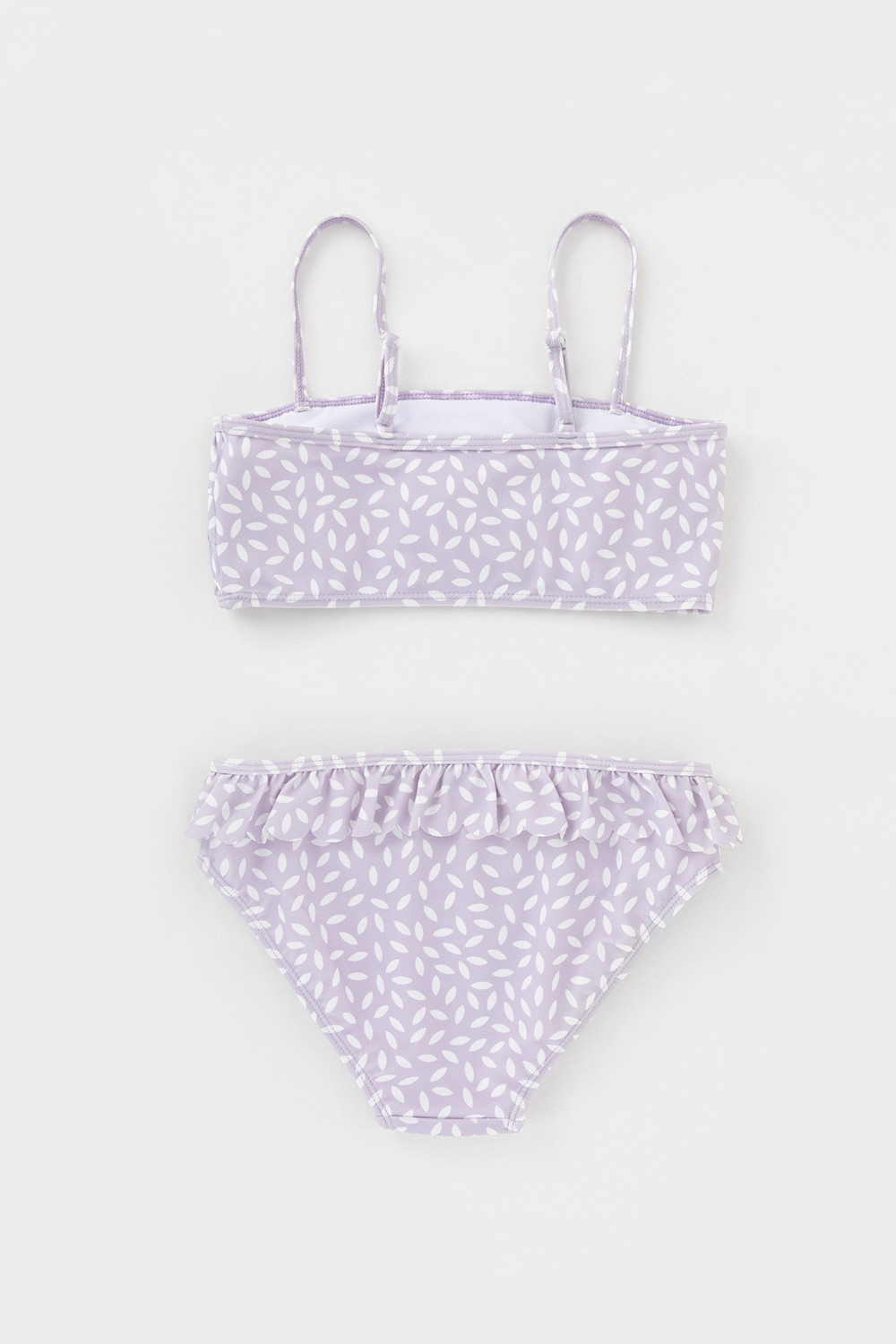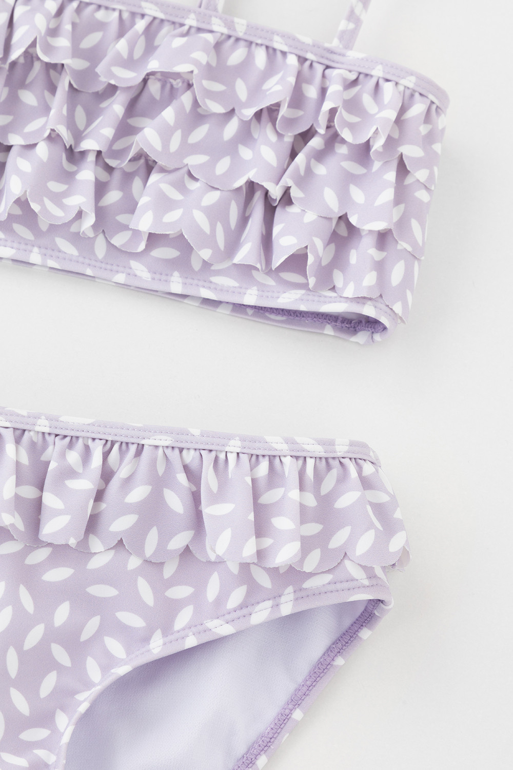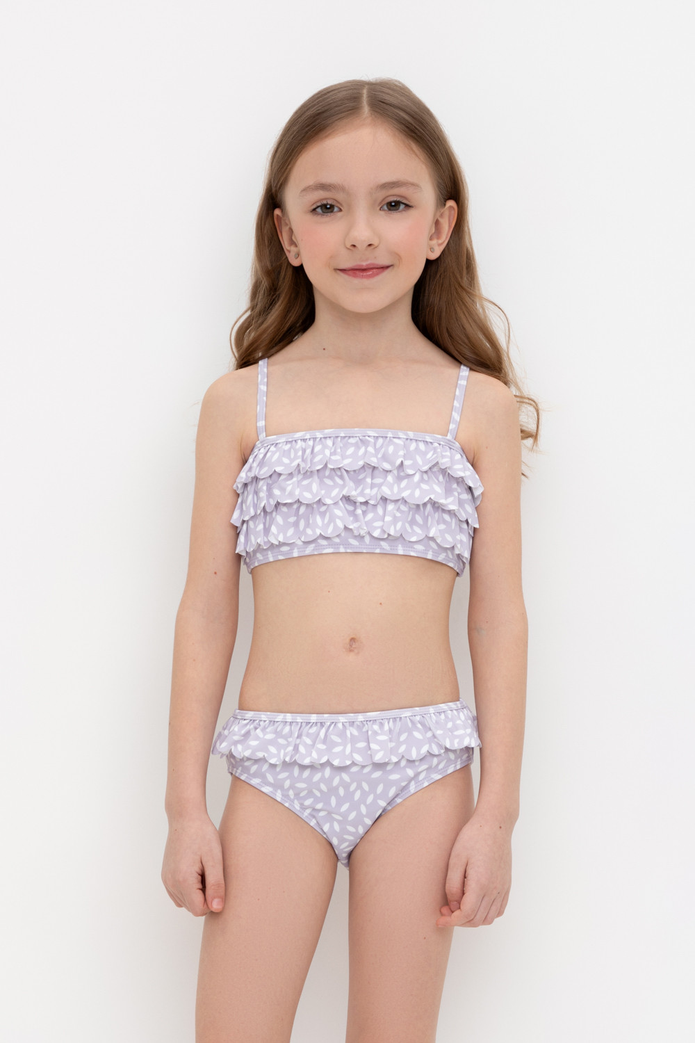 Раздельный купальник для девочки. Топ на эластичных бретелях. Плавки с оборкой на резинке. На груди и спинке воздушные оборки.