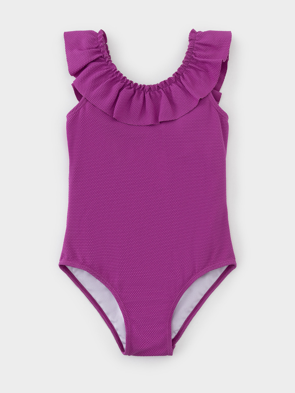 Слитный купальник на лямках для девочки. Украшен оборками. Внутри подклад.