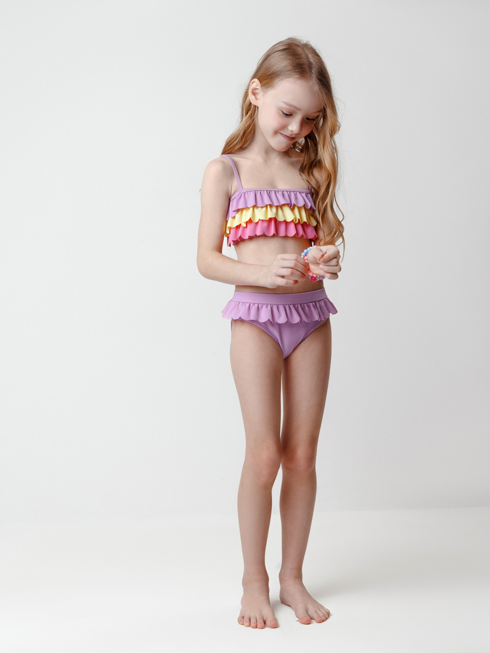 Раздельный купальник для девочки. Топ на регулируемых бретелях и плавки на эластичной резинке. Внутри подклад. Украшен воздушными оборками.