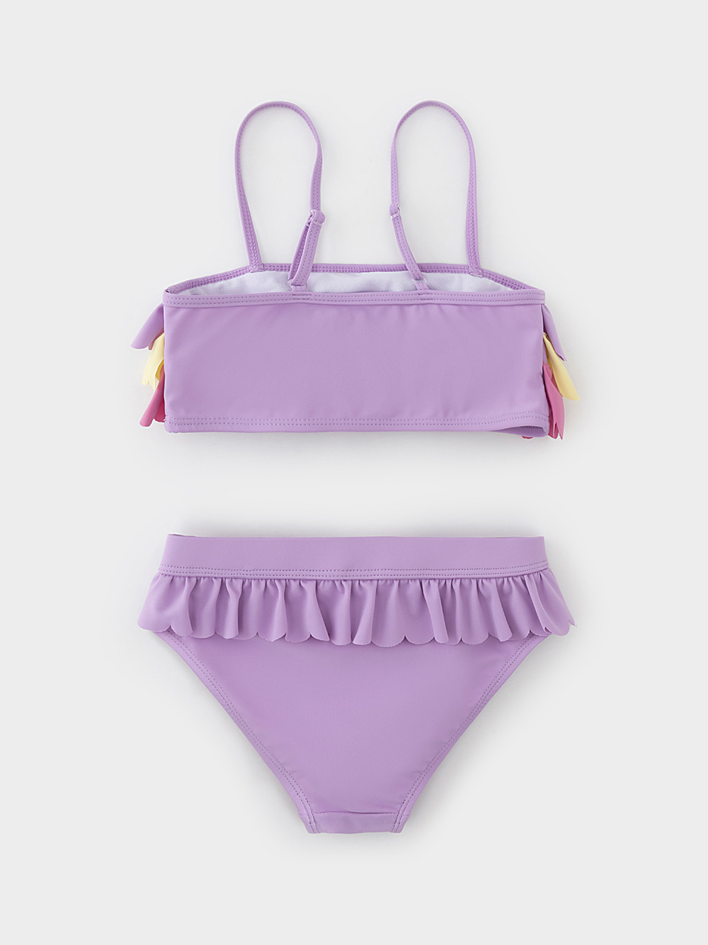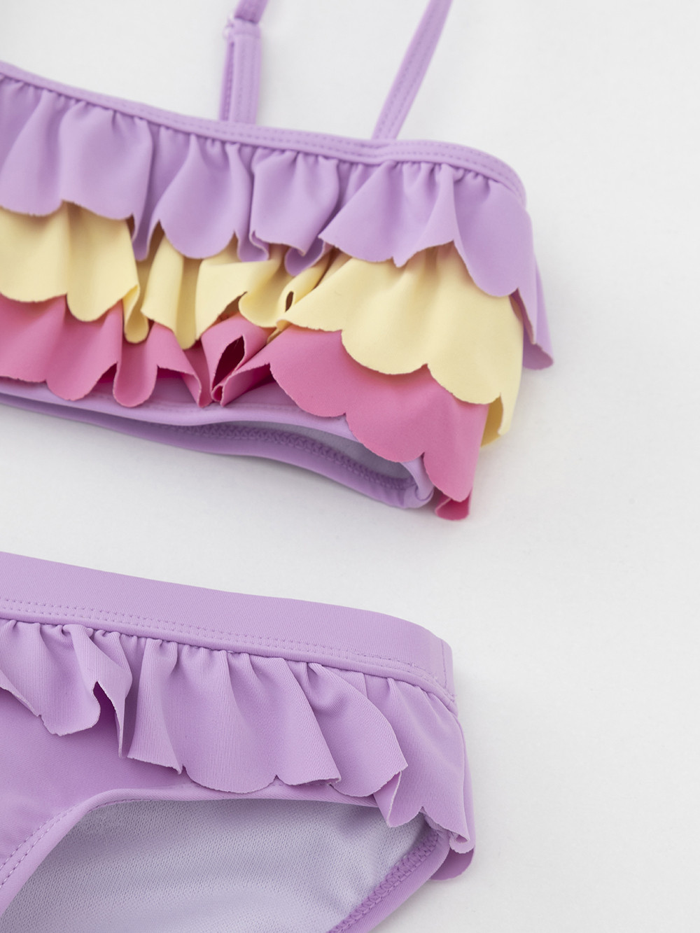 Раздельный купальник для девочки. Топ на регулируемых бретелях и плавки на эластичной резинке. Внутри подклад. Украшен воздушными оборками.