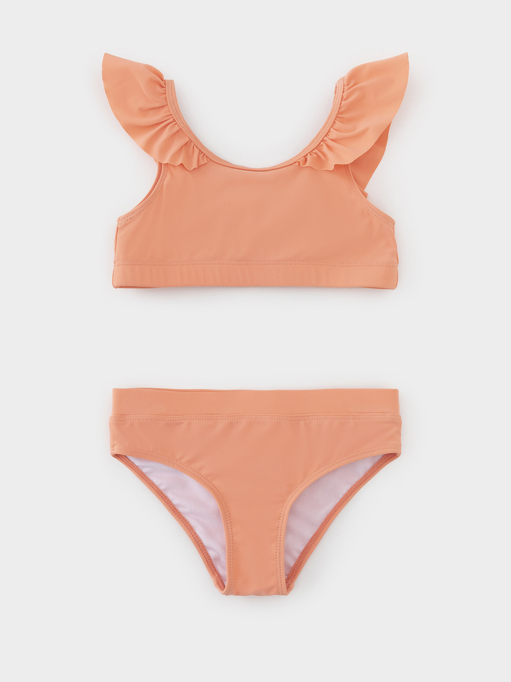 Раздельный купальник для девочки. Топ на эластичных лямках и плавки на резинке. Внутри подклад. Украшен воздушными оборками.