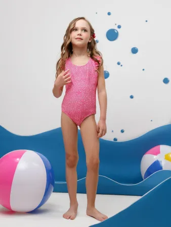 Слитный купальник на бретелях для девочки. Украшен оборками. Внутри подклад. Оригинальная набивка выполнена из стойких гипоаллергенных красителей.