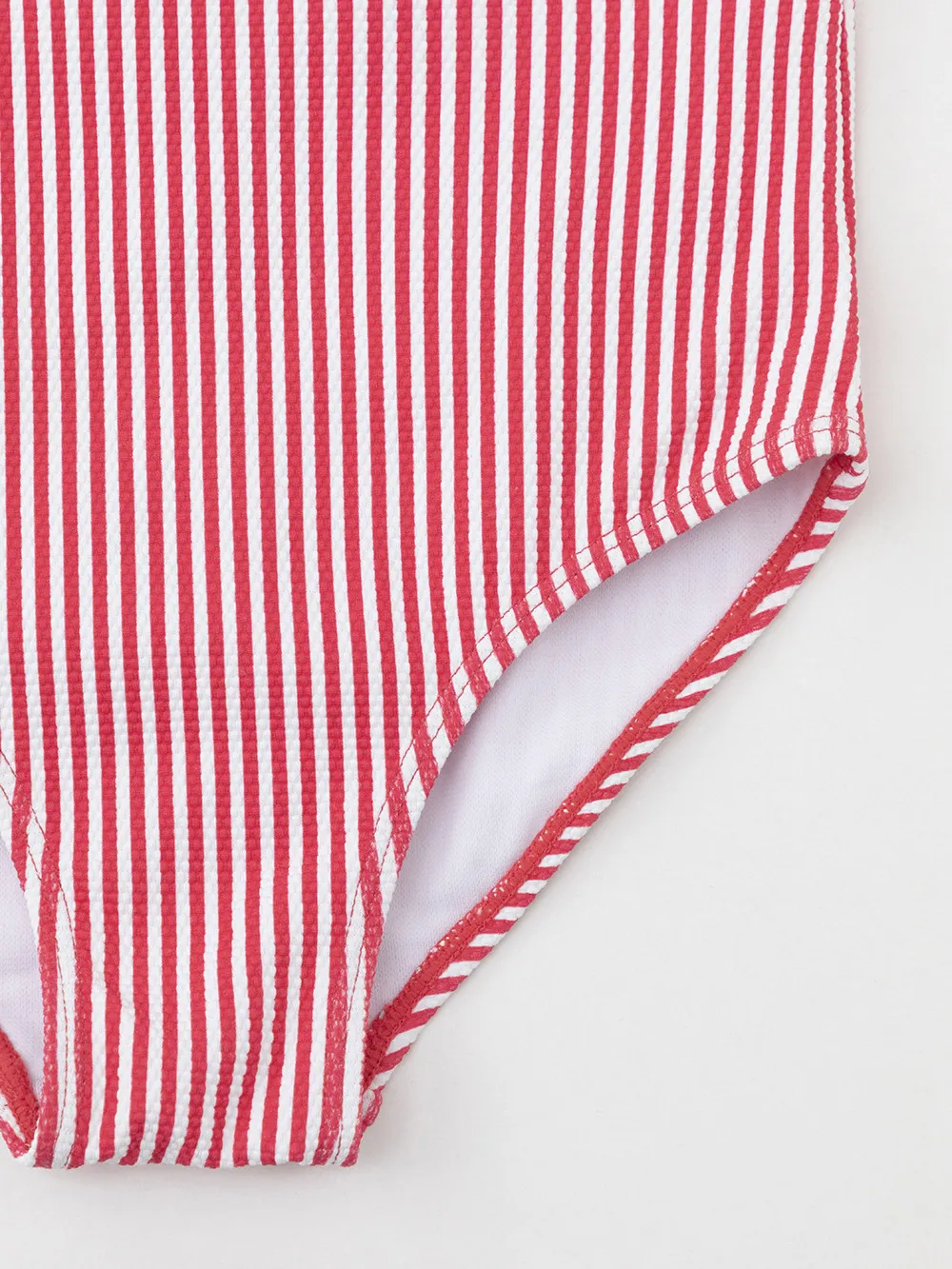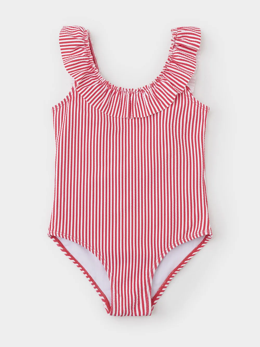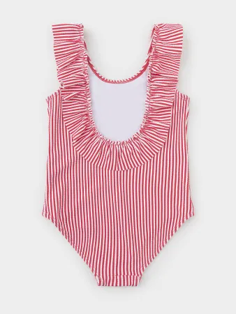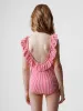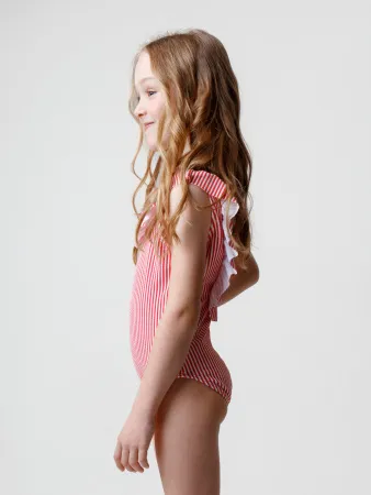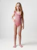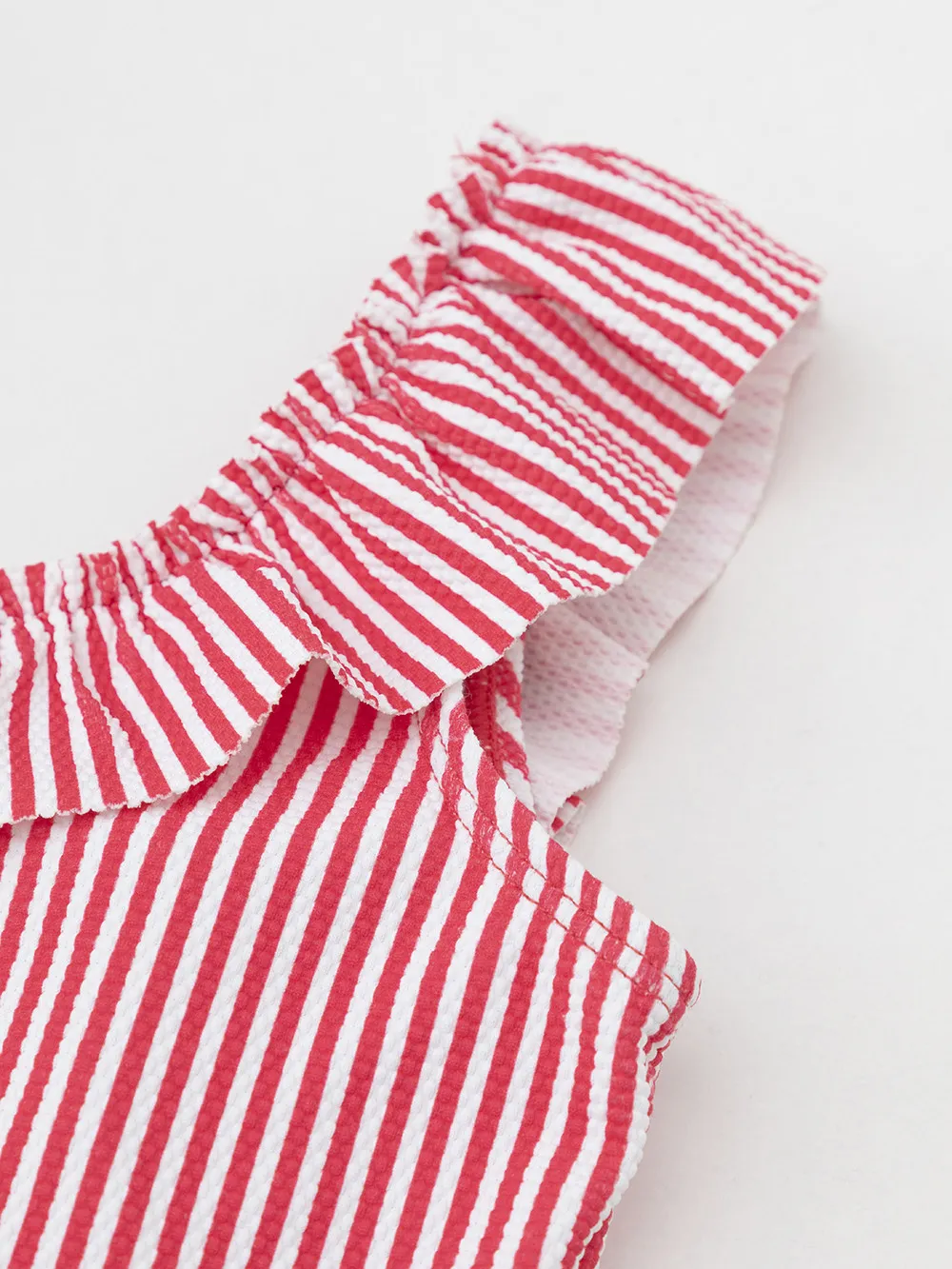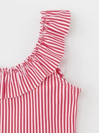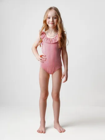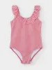 Слитный купальник на лямках для девочки. Украшен оборками. Внутри подклад. Оригинальная набивка выполнена из стойких гипоаллергенных красителей.
