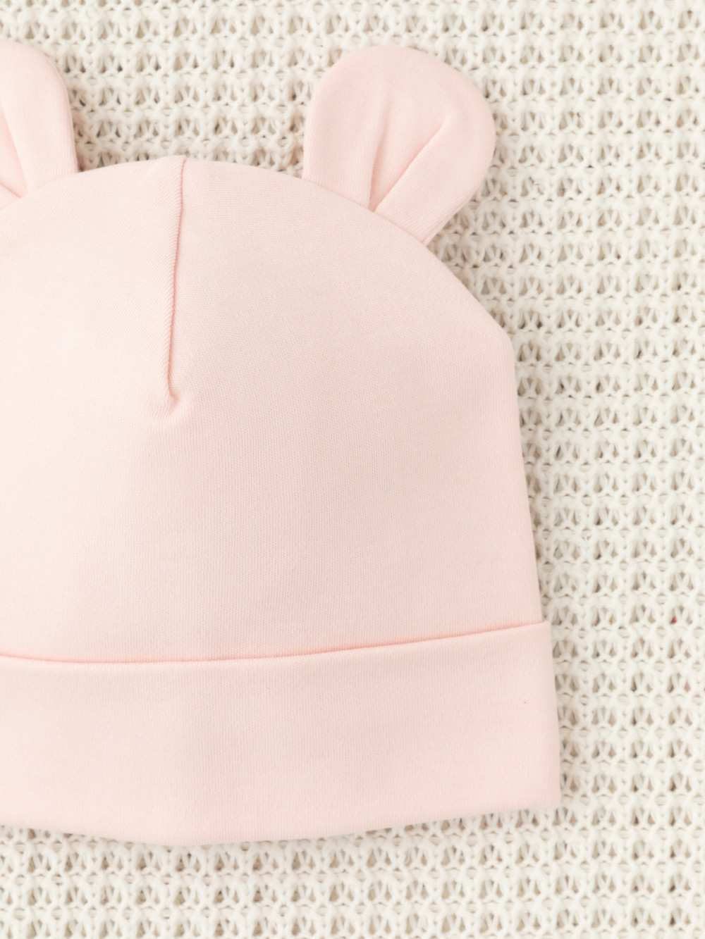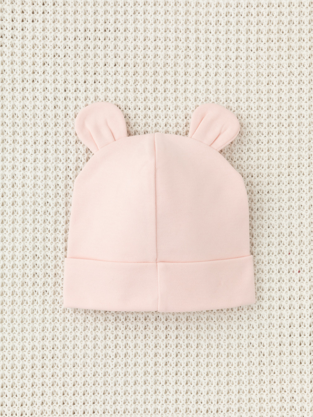 Шапка с отворотом для новорождённых из мягкого эластичного трикотажа интерлок, произведённого из натурального хлопка. Украшена декоративными ушками. Все трикотажные полотна производятся в соответствии с нормами Швейцарского сертификата ЭкоТекс.
