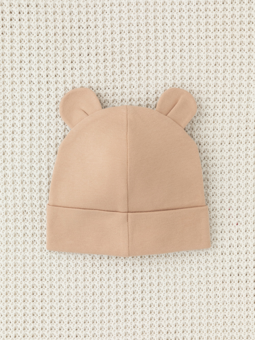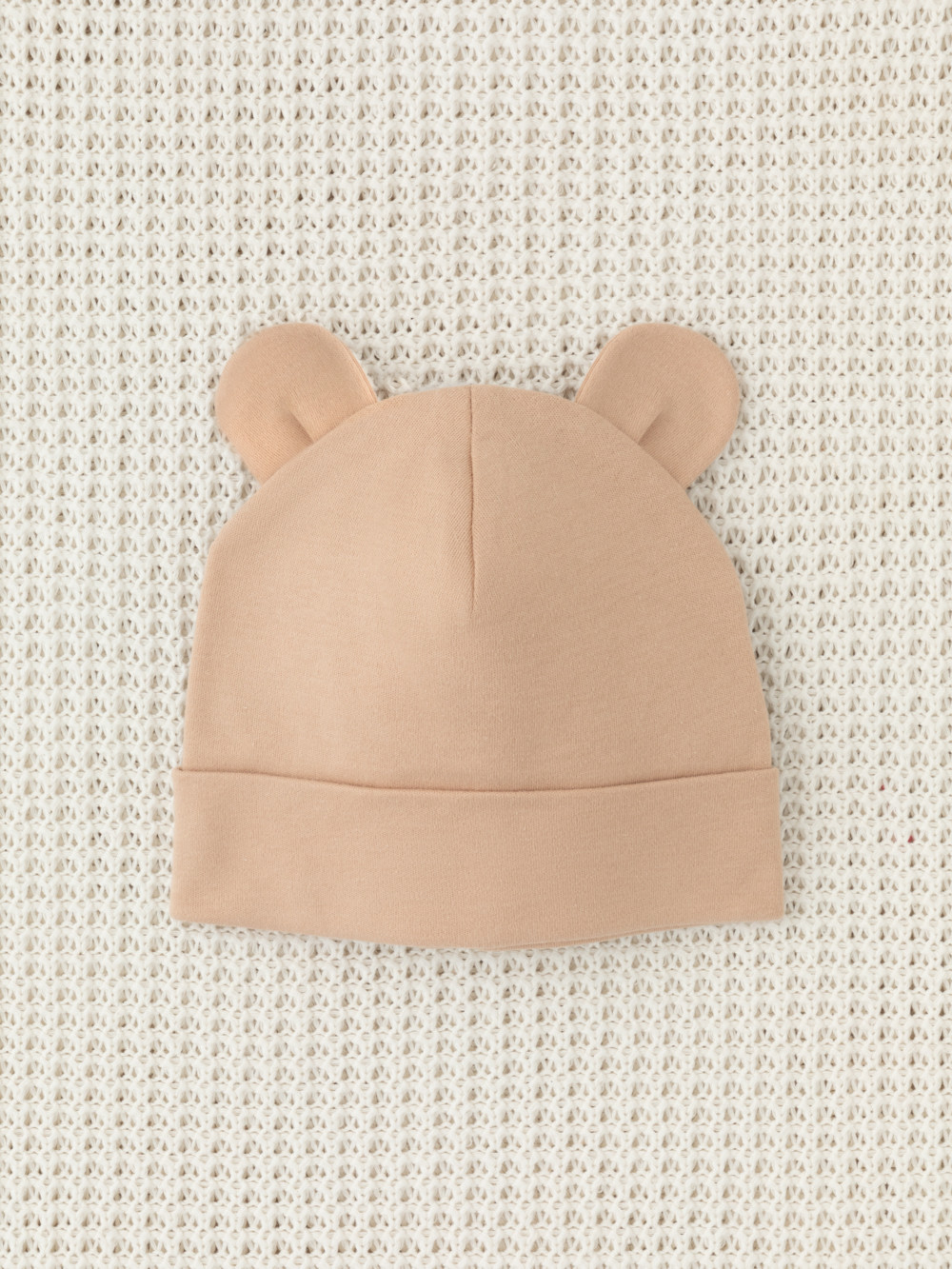 Шапка с отворотом для новорождённых из мягкого эластичного трикотажа интерлок, произведённого из натурального хлопка. Украшена декоративными ушками. Все трикотажные полотна производятся в соответствии с нормами Швейцарского сертификата ЭкоТекс.