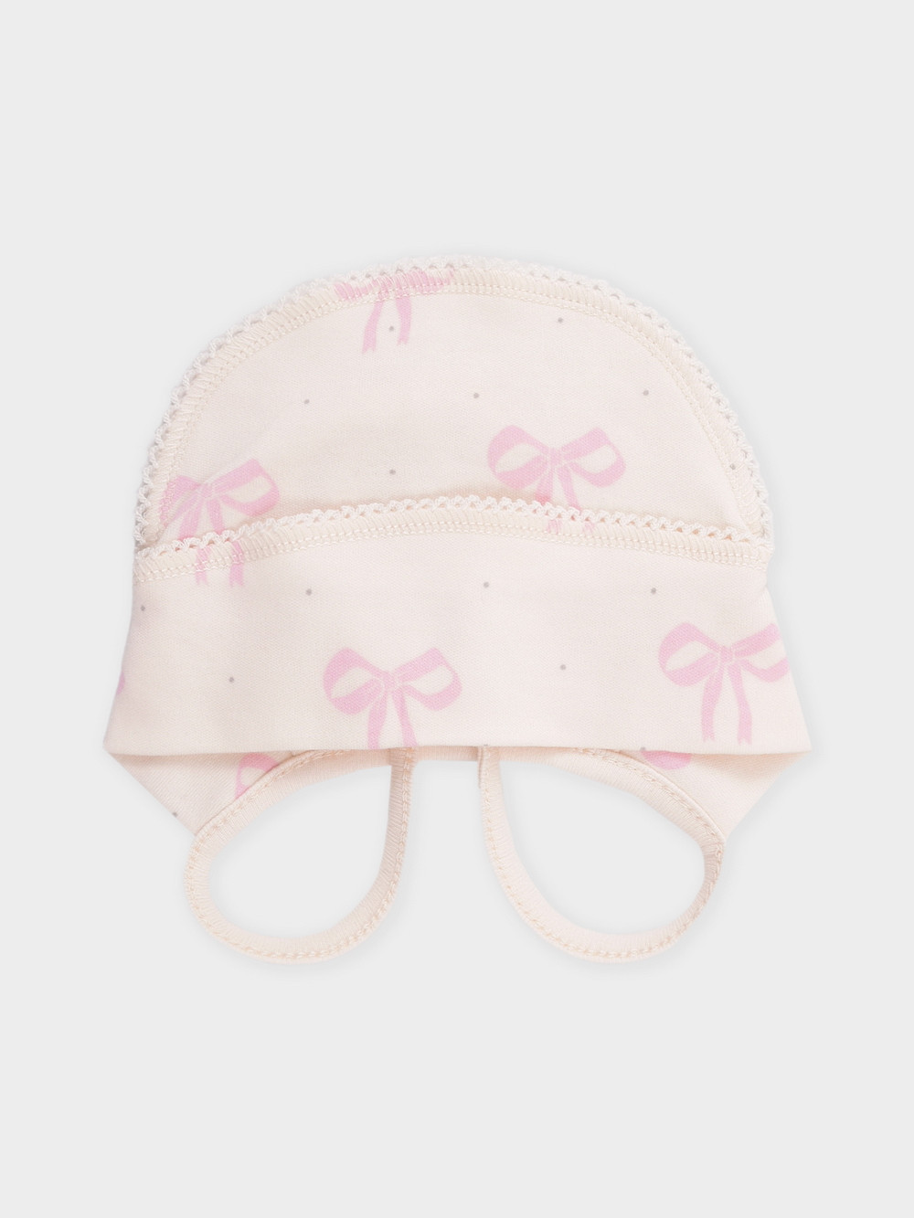 Шапочка на завязках для новорождённых. Изготовлена из мягкого эластичного трикотажа интерлок, произведённого из натурального хлопка. Все трикотажные полотна производятся в соответствии с нормами швейцарского сертификата ЭкоТекс.