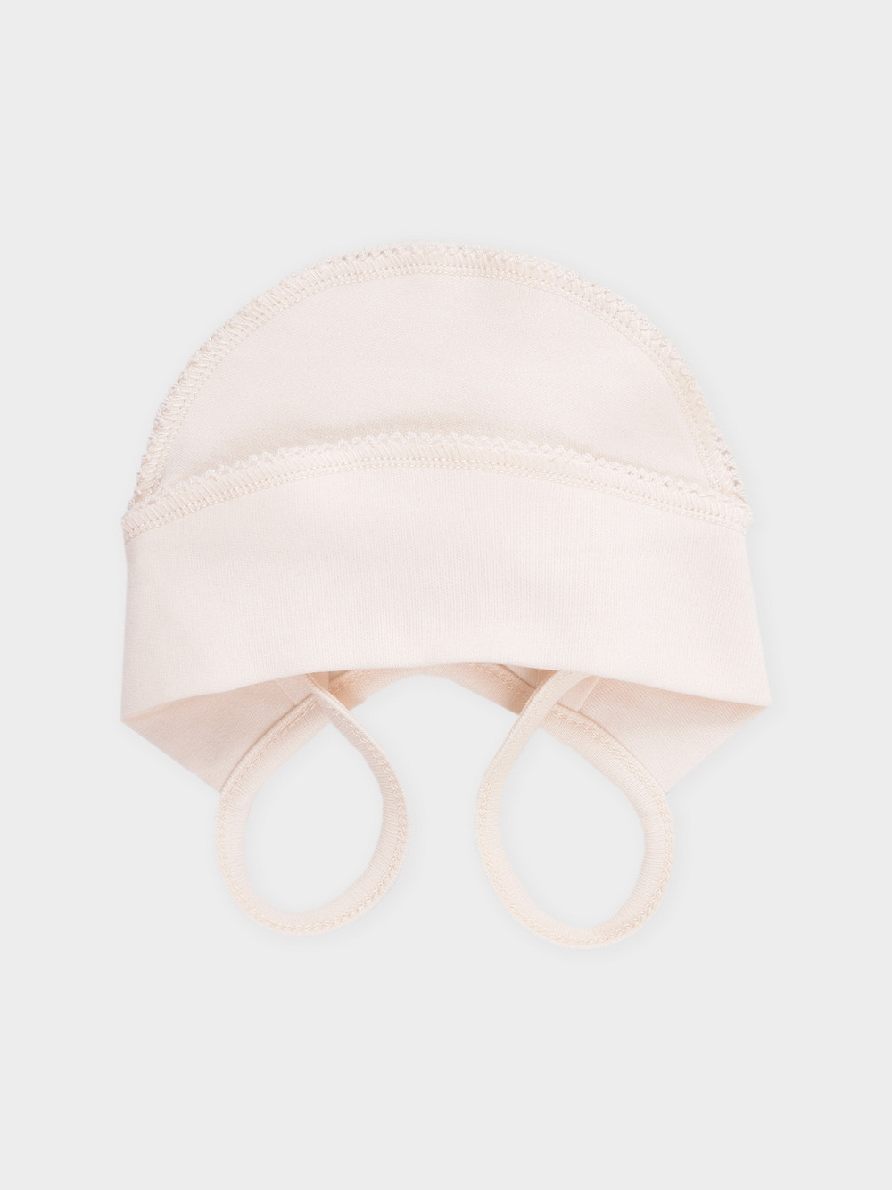 Шапочка на завязках для новорождённых. Изготовлена из мягкого эластичного трикотажа интерлок, произведённого из натурального хлопка. Все трикотажные полотна производятся в соответствии с нормами швейцарского сертификата ЭкоТекс.