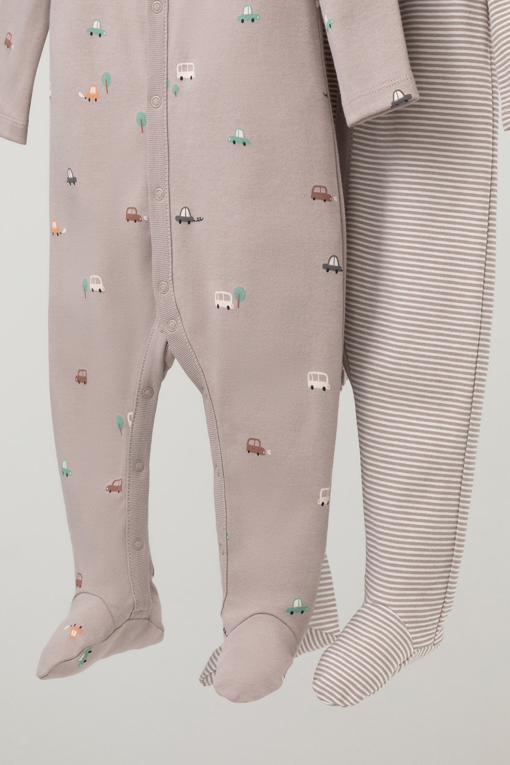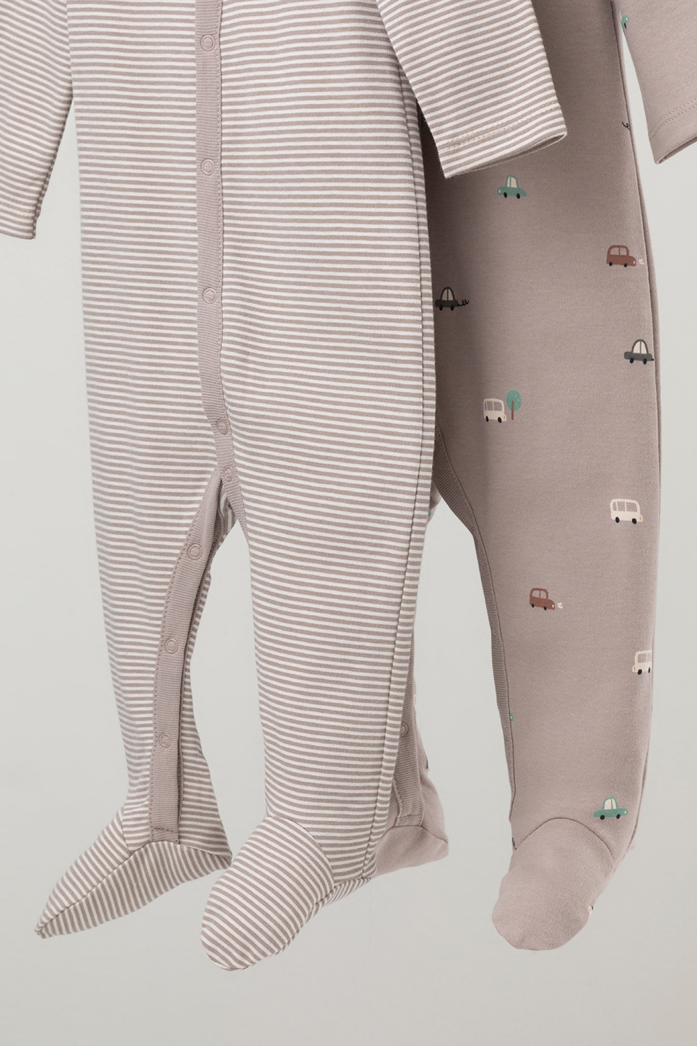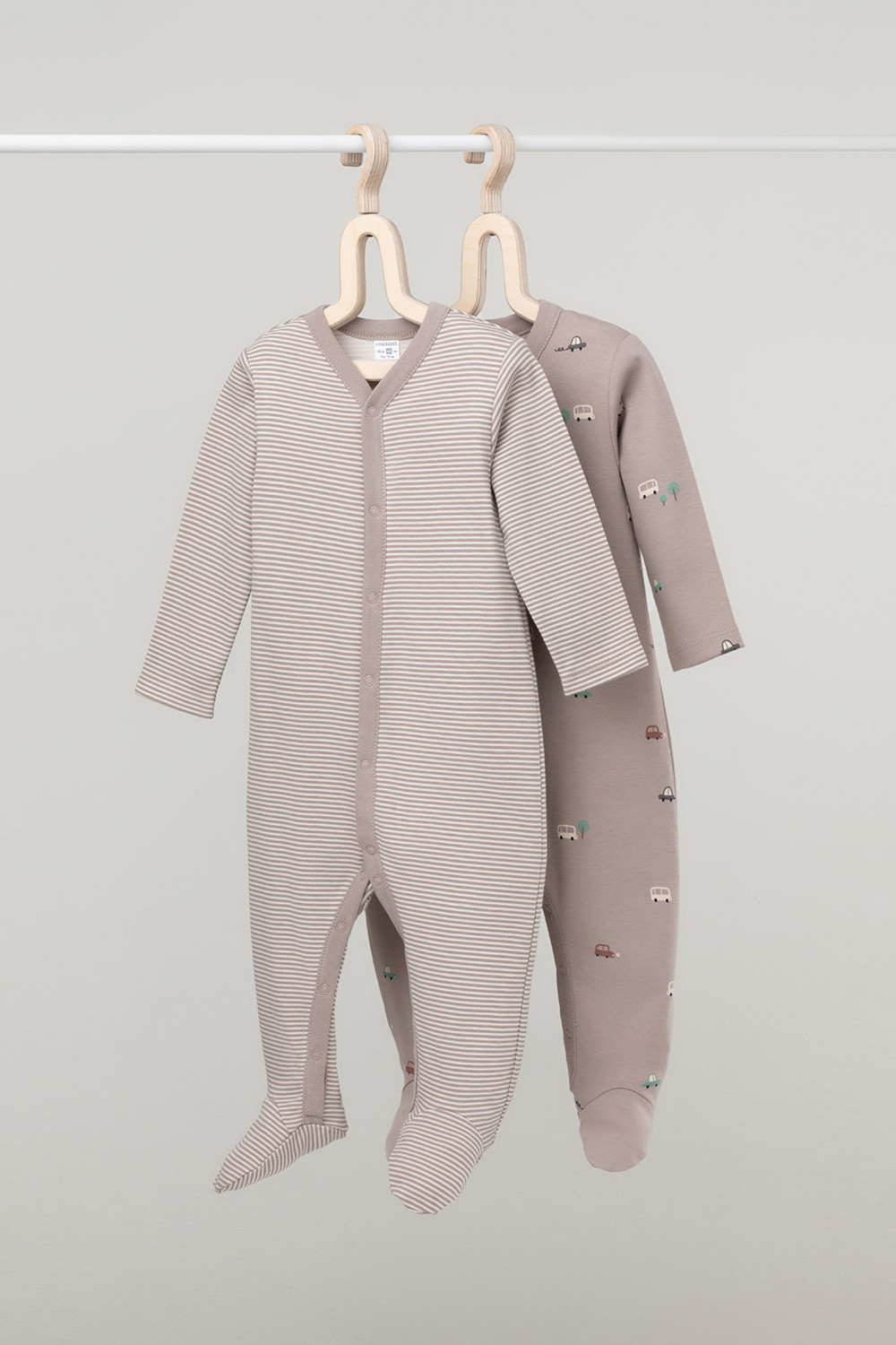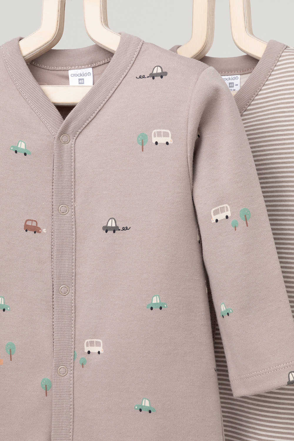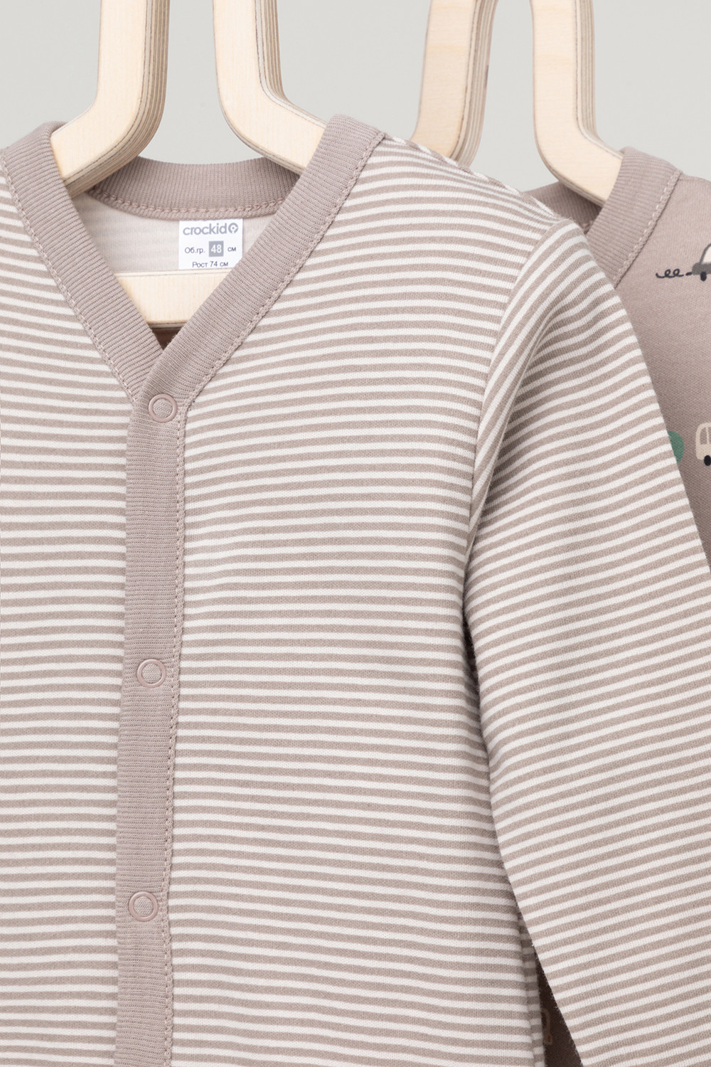 Комбинезоны для новорождённых из мягкого эластичного трикотажа интерлок, произведённого из натурального хлопка. В упаковке 2 штуки. Застёгиваются сбоку на молнию и на кнопку. Длинные рукава-реглан оканчиваются манжетами. Оригинальная набивка выполнена из стойких гипоаллергенных текстильных красителей. Все трикотажные полотна производятся в соответствии с нормами Швейцарского сертификата ЭкоТекс.