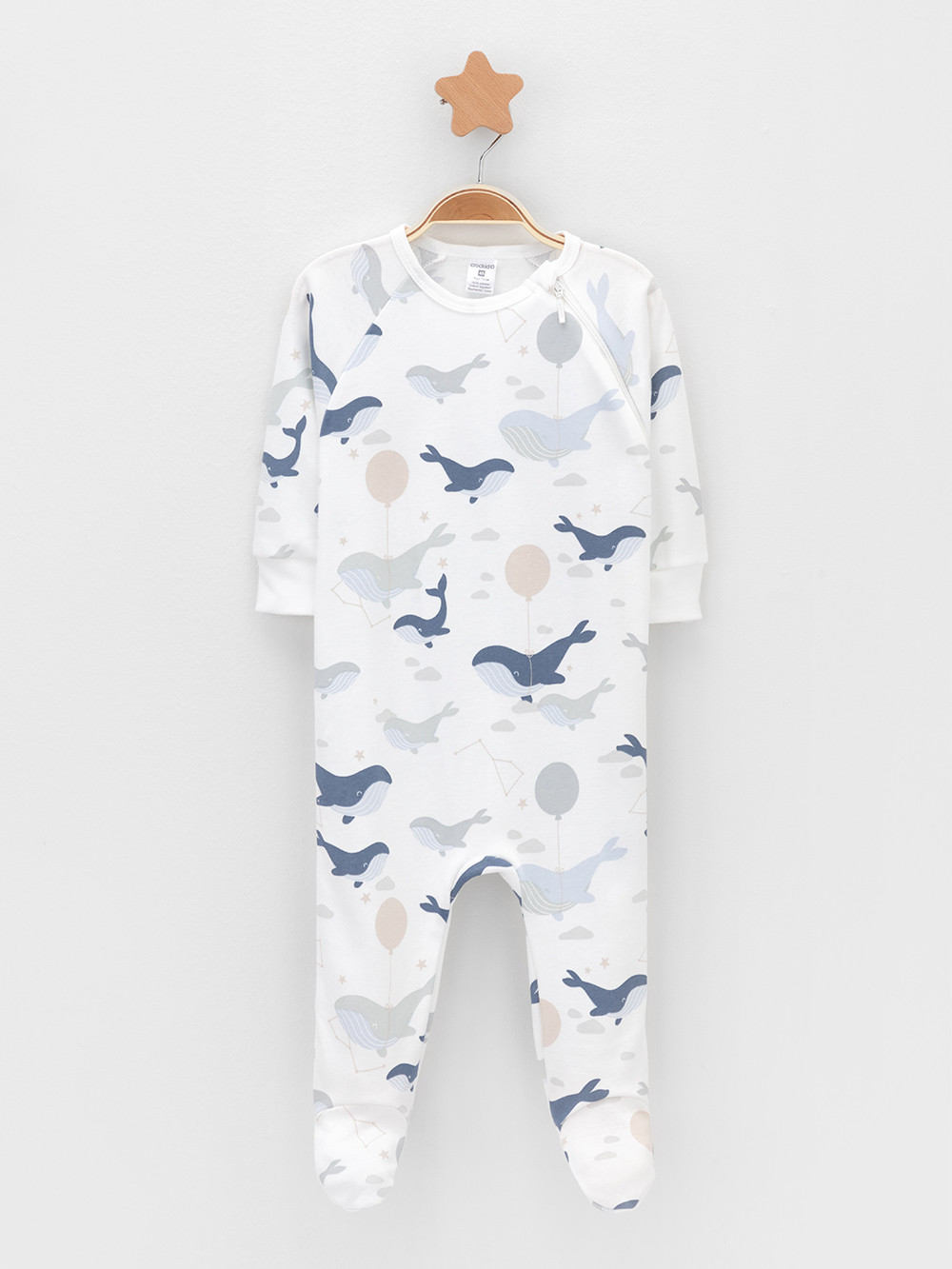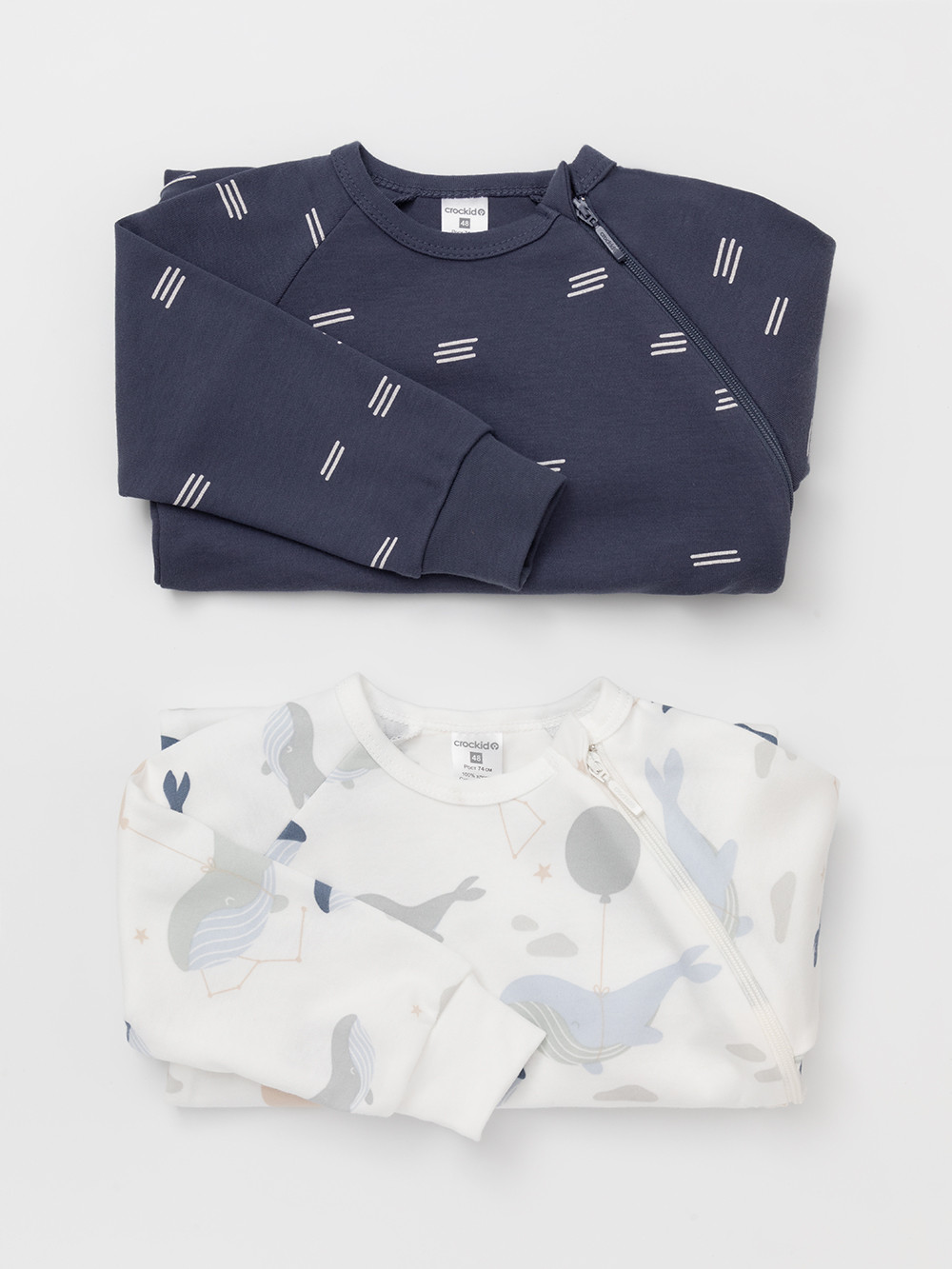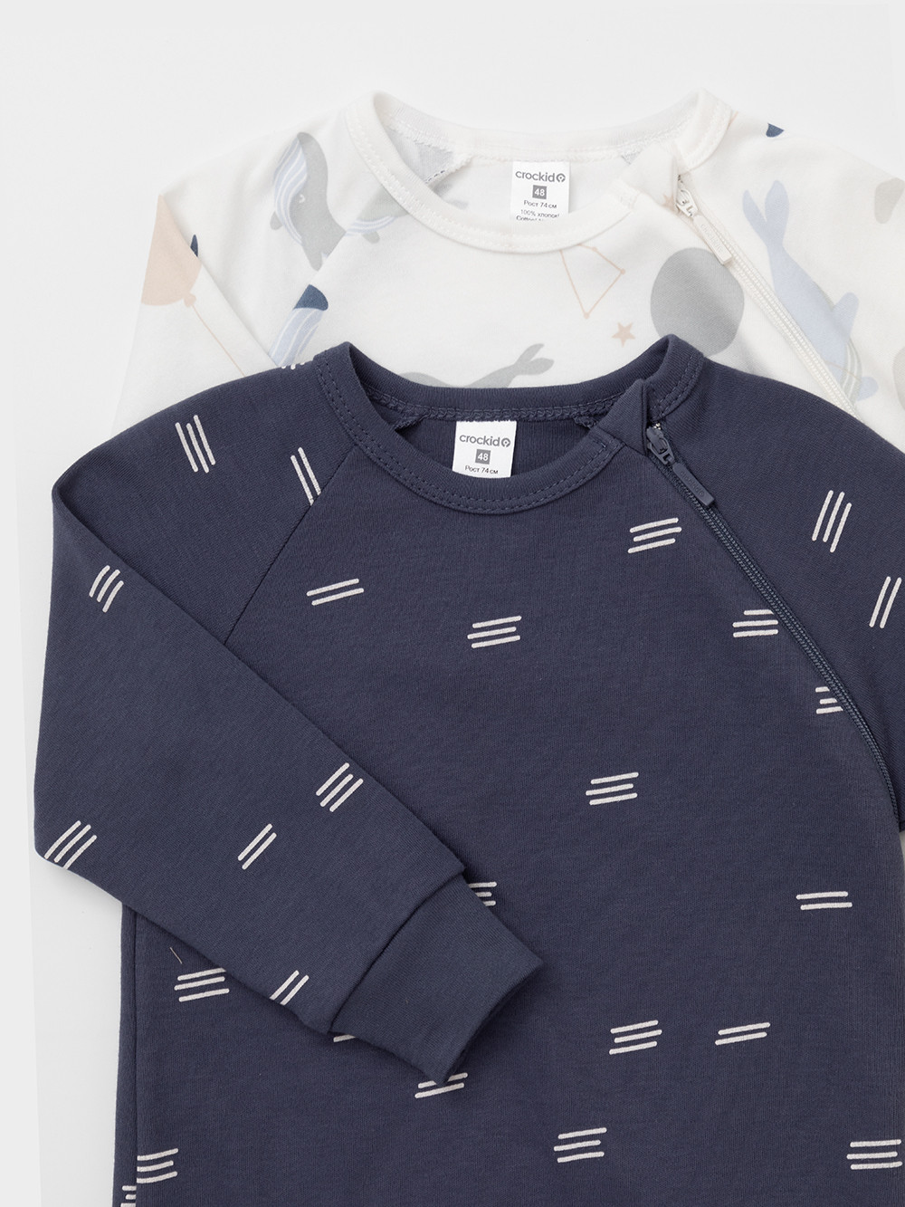 Комбинезоны для новорождённых из мягкого эластичного трикотажа интерлок, произведённого из натурального хлопка. В упаковке 2 штуки. Застёгиваются сбоку на молнию и на кнопку. Длинные рукава-реглан оканчиваются манжетами. Оригинальная набивка выполнена из стойких гипоаллергенных текстильных красителей. Все трикотажные полотна производятся в соответствии с нормами Швейцарского сертификата ЭкоТекс.