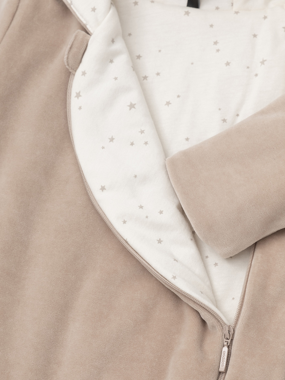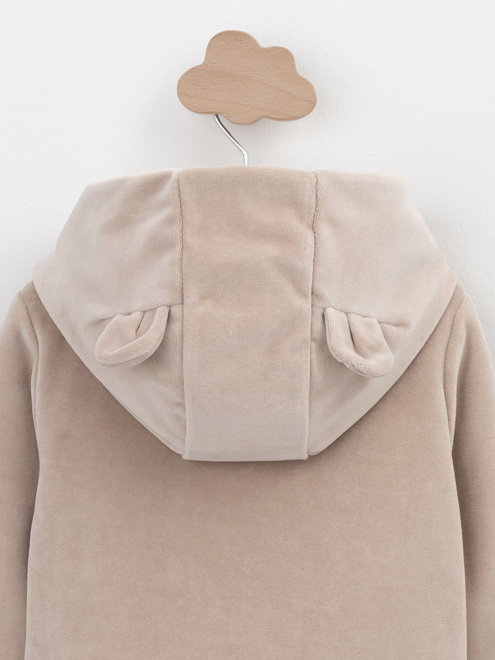 Тёплый комбинезон из велюра для новорождённых. Внутри синтепон и подклад из натурального хлопка. Изделие застёгивается на молнию и имеет капюшон. В размерах 80 и 86 на ножках манжеты. Все трикотажные полотна производятся в соответствии с нормами Швейцарского сертификата ЭкоТекс.