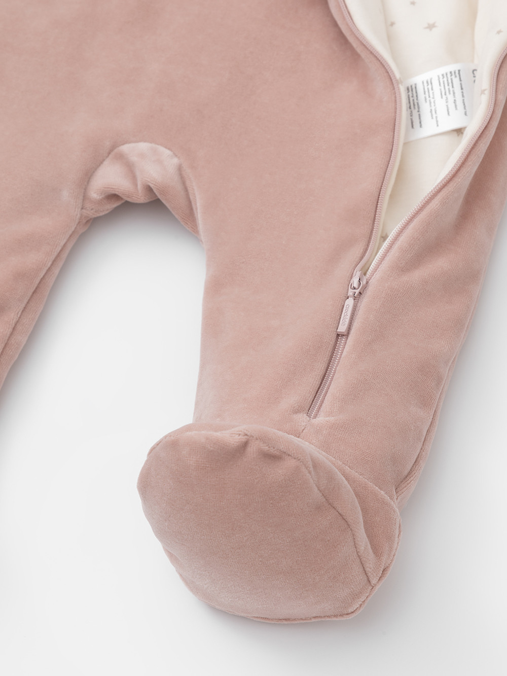 Тёплый комбинезон из велюра для новорождённых. Внутри синтепон и подклад из натурального хлопка. Изделие застёгивается на молнию и имеет капюшон. В размерах 80 и 86 на ножках манжеты. Все трикотажные полотна производятся в соответствии с нормами Швейцарского сертификата ЭкоТекс.