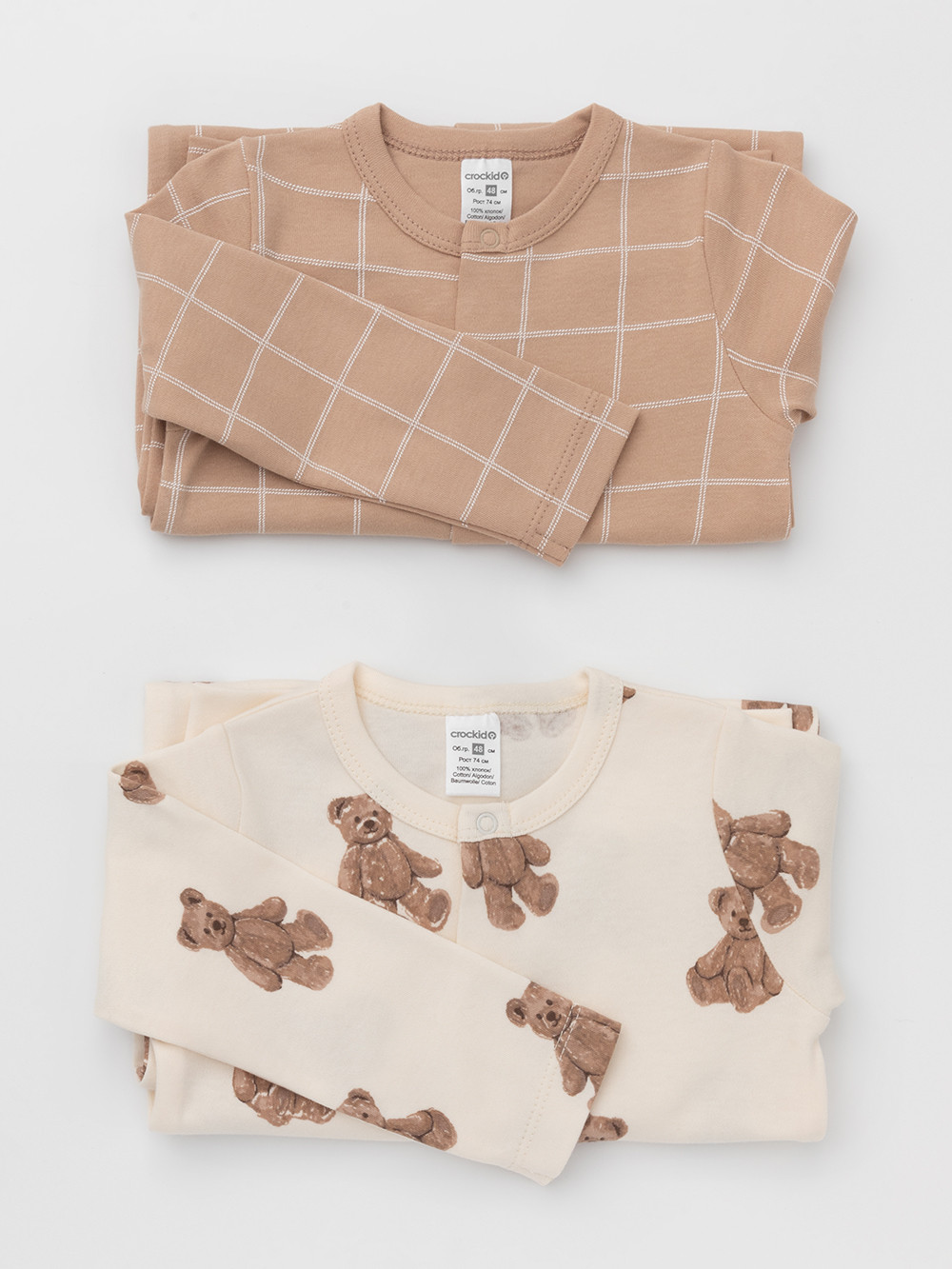 Комбинезоны для новорождённых из мягкого эластичного трикотажа, произведённого из натурального хлопка. В упаковке 2 штуки. Застёгиваются спереди на кнопки. Оригинальная набивка выполнена из стойких гипоаллергенных текстильных красителей. Все трикотажные полотна производятся в соответствии с нормами швейцарского сертификата ЭкоТекс.