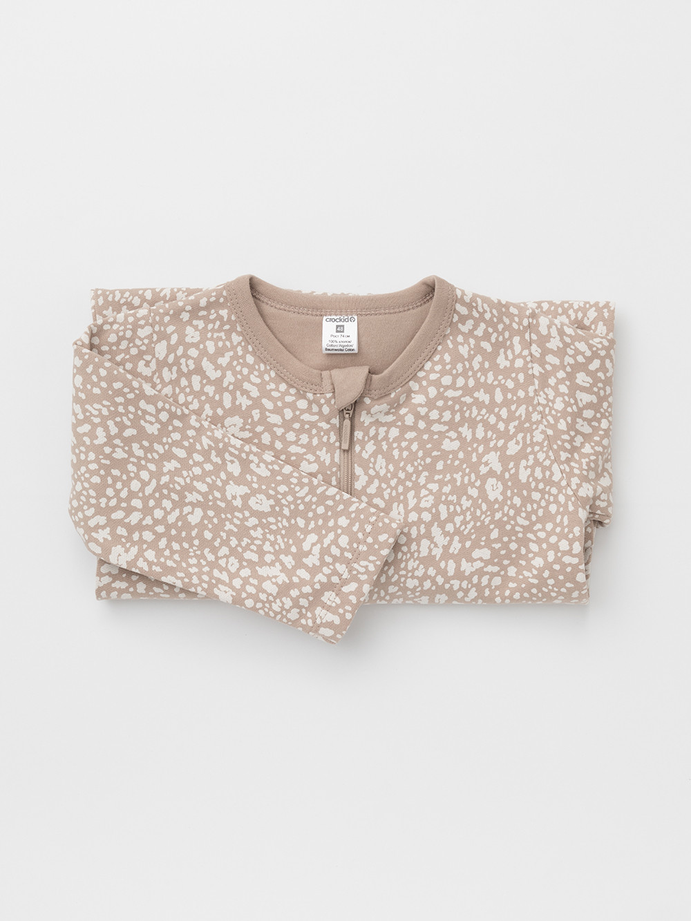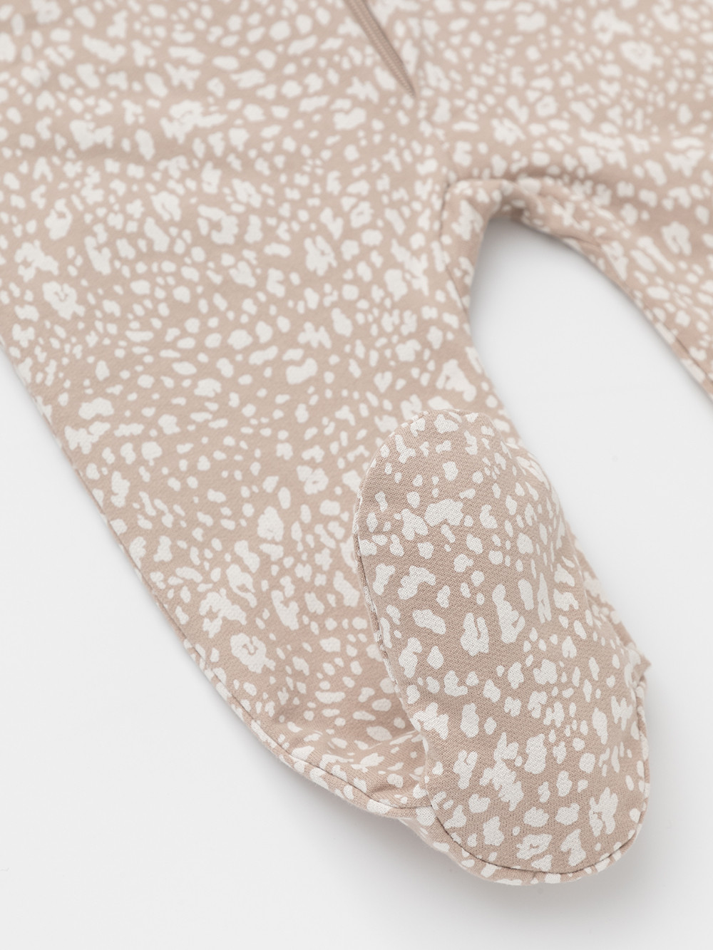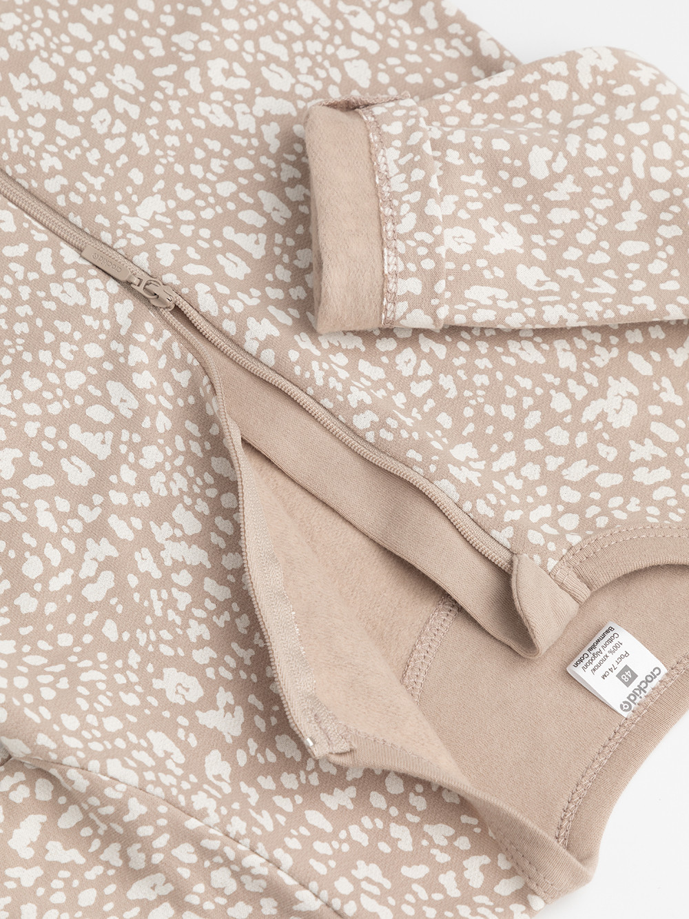 Комбинезон для новорождённых из тонкого футера с начёсом, произведённого из натурального хлопка. Застёгиваются спереди на молнию с мягкой защитой шеи и подбородка. Оригинальная набивка выполнена из стойких гипоаллергенных текстильных красителей. Все трикотажные полотна производятся в соответствии с нормами швейцарского сертификата ЭкоТекс.