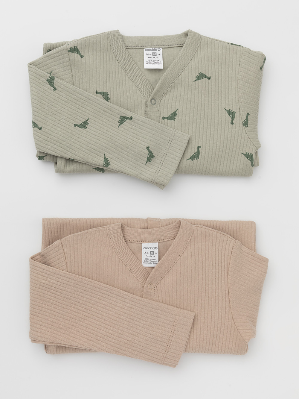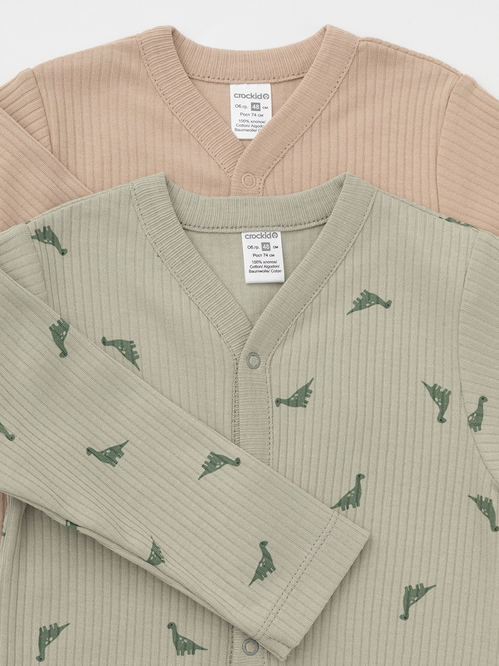 Комбинезоны для новорождённых из мягкого эластичного трикотажа, произведённого из натурального хлопка. В упаковке 2 штуки. Застёгиваются спереди на кнопки. Оригинальная набивка выполнена из стойких гипоаллергенных текстильных красителей. Все трикотажные полотна производятся в соответствии с нормами швейцарского сертификата ЭкоТекс.