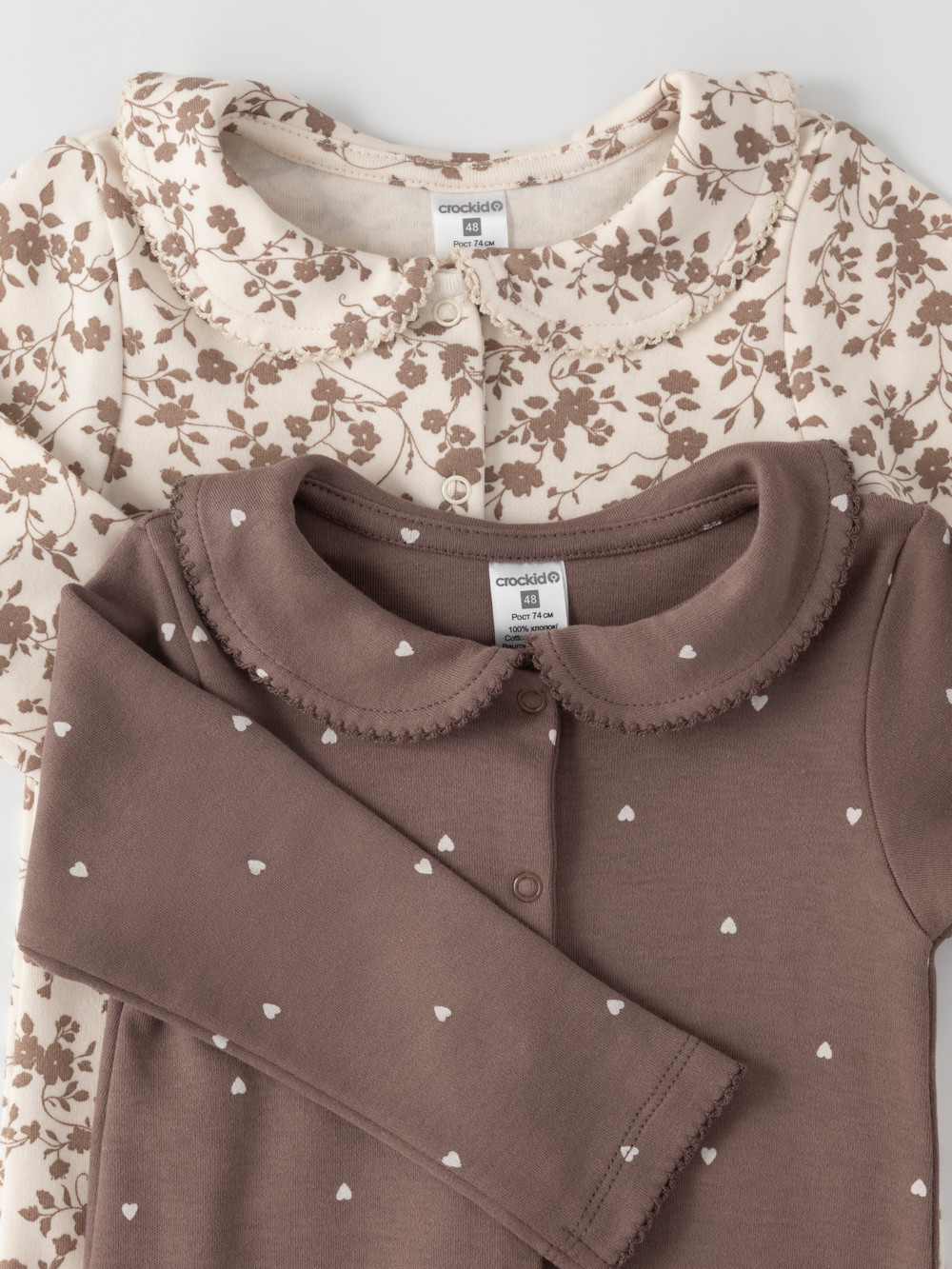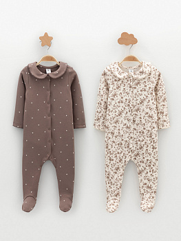 Комбинезоны для новорождённых из мягкого эластичного трикотажа, произведённого из натурального хлопка. В упаковке 2 штуки. Застёгиваются спереди на кнопки. В размере 56 на рукавах предусмотрены антицарапки, швы выполнены наружу. Украшены воротничком. Оригинальная набивка выполнена из стойких гипоаллергенных текстильных красителей. Все трикотажные полотна производятся в соответствии с нормами швейцарского сертификата ЭкоТекс.