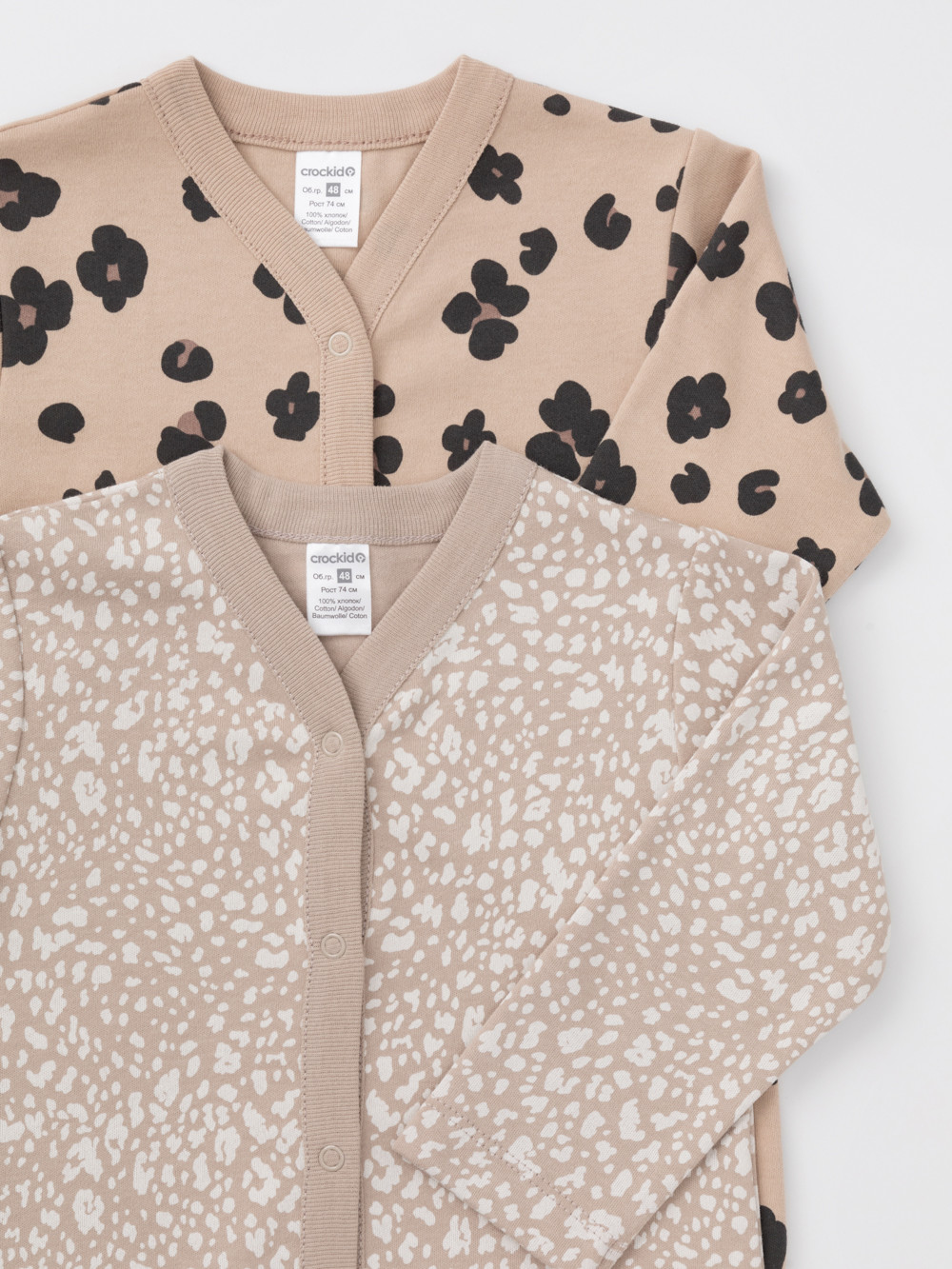 Комбинезоны для новорождённых из мягкого эластичного трикотажа интерлок, произведённого из натурального хлопка. В упаковке 2 штуки. Застёгиваются спереди на кнопки. В размере 56 на рукавах предусмотрены антицарапки, швы выполнены наружу. Оригинальная набивка выполнена из стойких гипоаллергенных текстильных красителей. Все трикотажные полотна производятся в соответствии с нормами швейцарского сертификата ЭкоТекс.