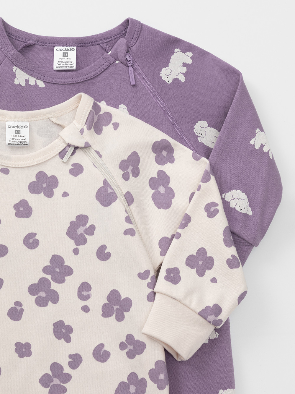 Комбинезоны для новорождённых из мягкого эластичного трикотажа интерлок, произведённого из натурального хлопка. В упаковке 2 штуки. Застёгиваются сбоку на молнию с мягкой защитой шеи и подбородка. Длинные рукава-реглан оканчиваются манжетами. Оригинальная набивка выполнена из стойких гипоаллергенных текстильных красителей. Все трикотажные полотна производятся в соответствии с нормами швейцарского сертификата ЭкоТекс.