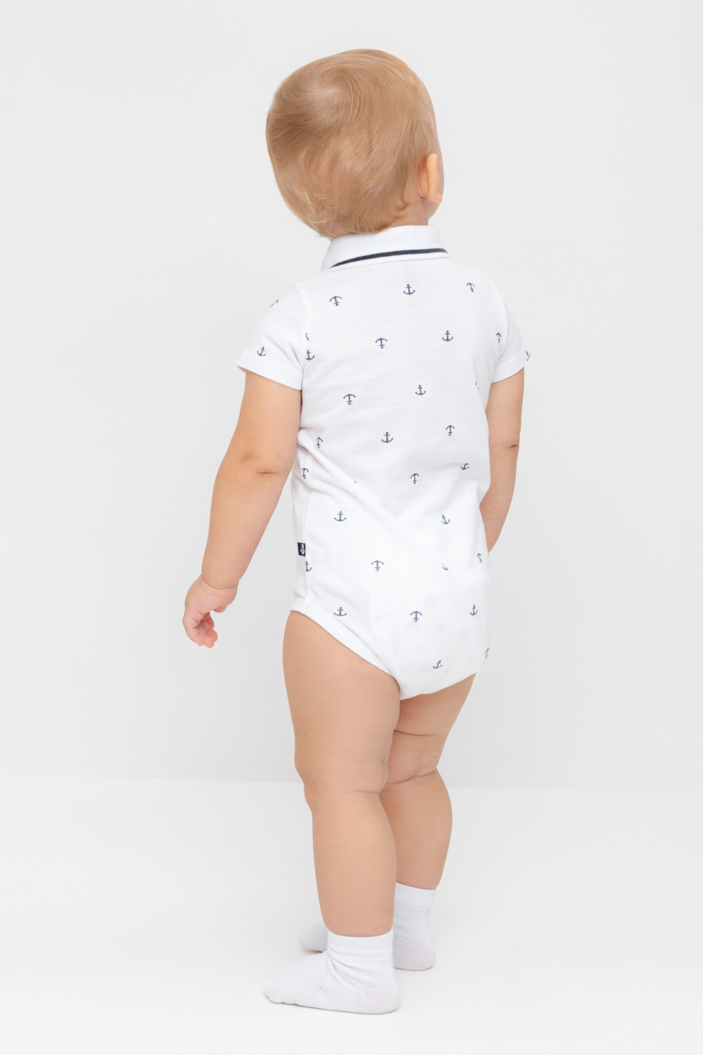Боди для мальчика из трикотажного набивного полотна пике. Вязаный воротник. Оригинальная набивка выполнена из стойких текстильных гипоаллергенных красителей. Удобная застежка на кнопки спереди и по низу изделия.