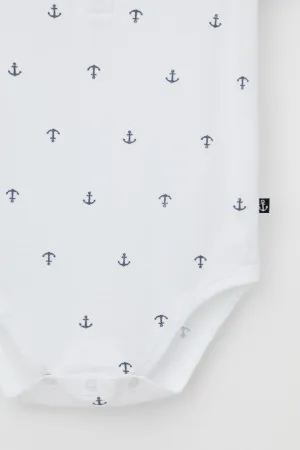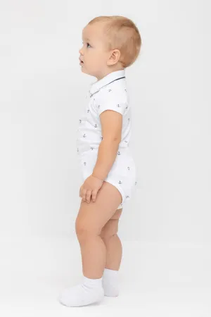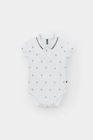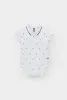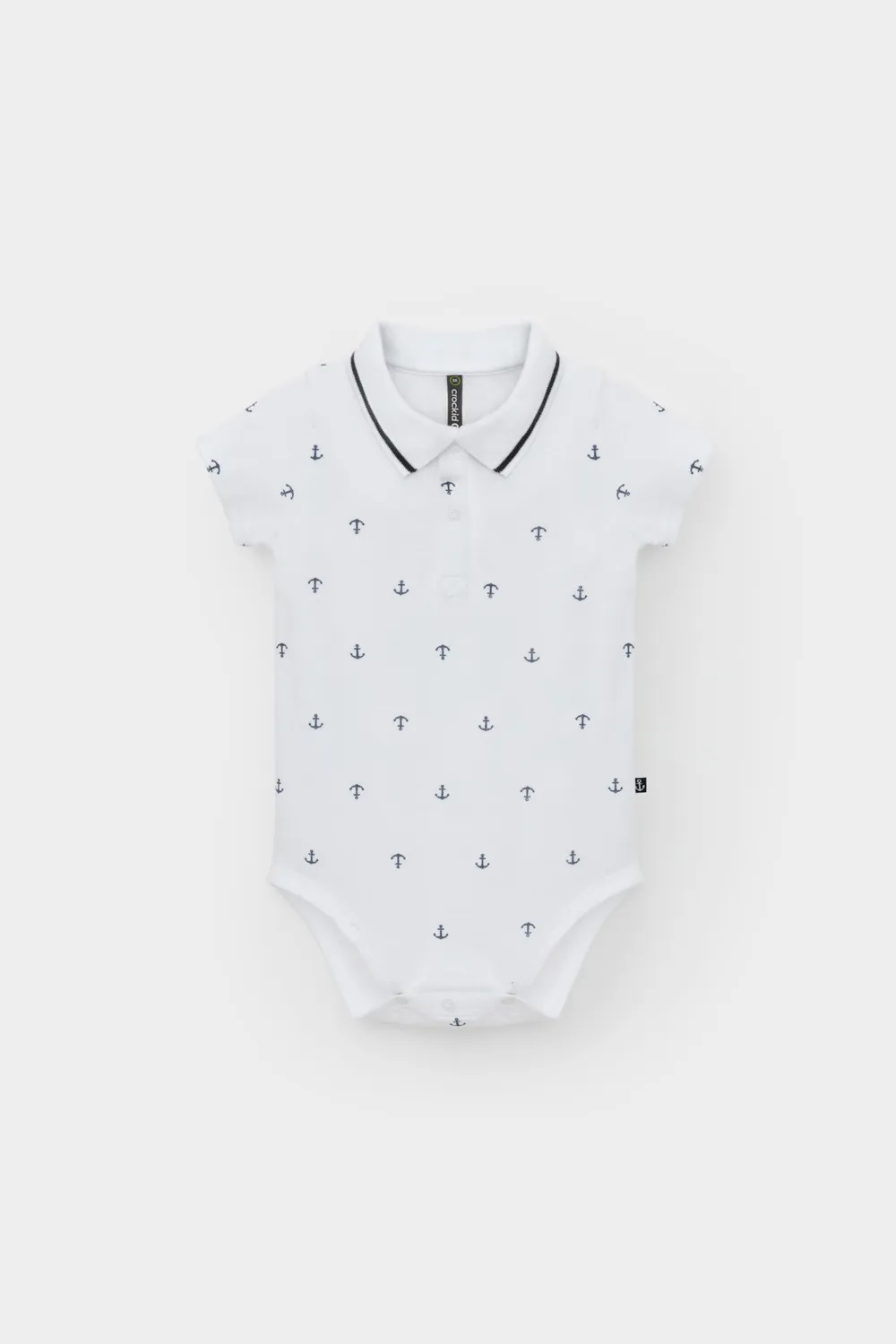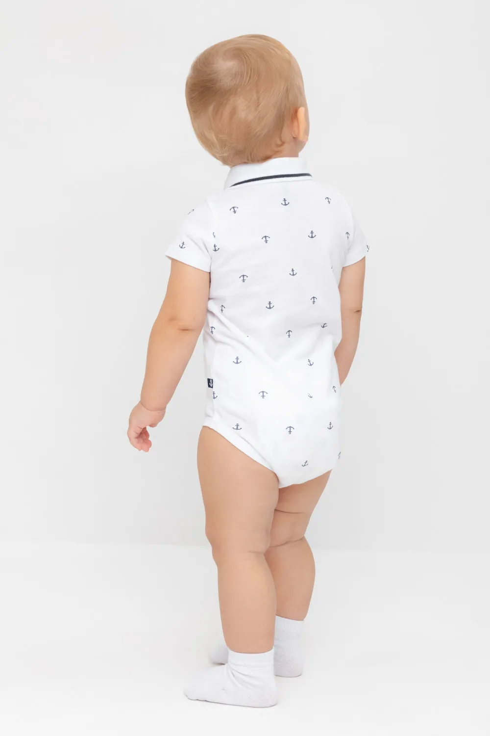 Боди для мальчика из трикотажного набивного полотна пике. Вязаный воротник. Оригинальная набивка выполнена из стойких текстильных гипоаллергенных красителей. Удобная застежка на кнопки спереди и по низу изделия.