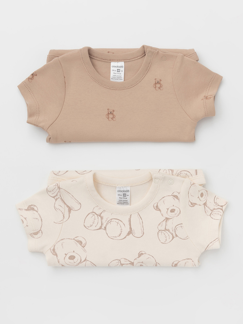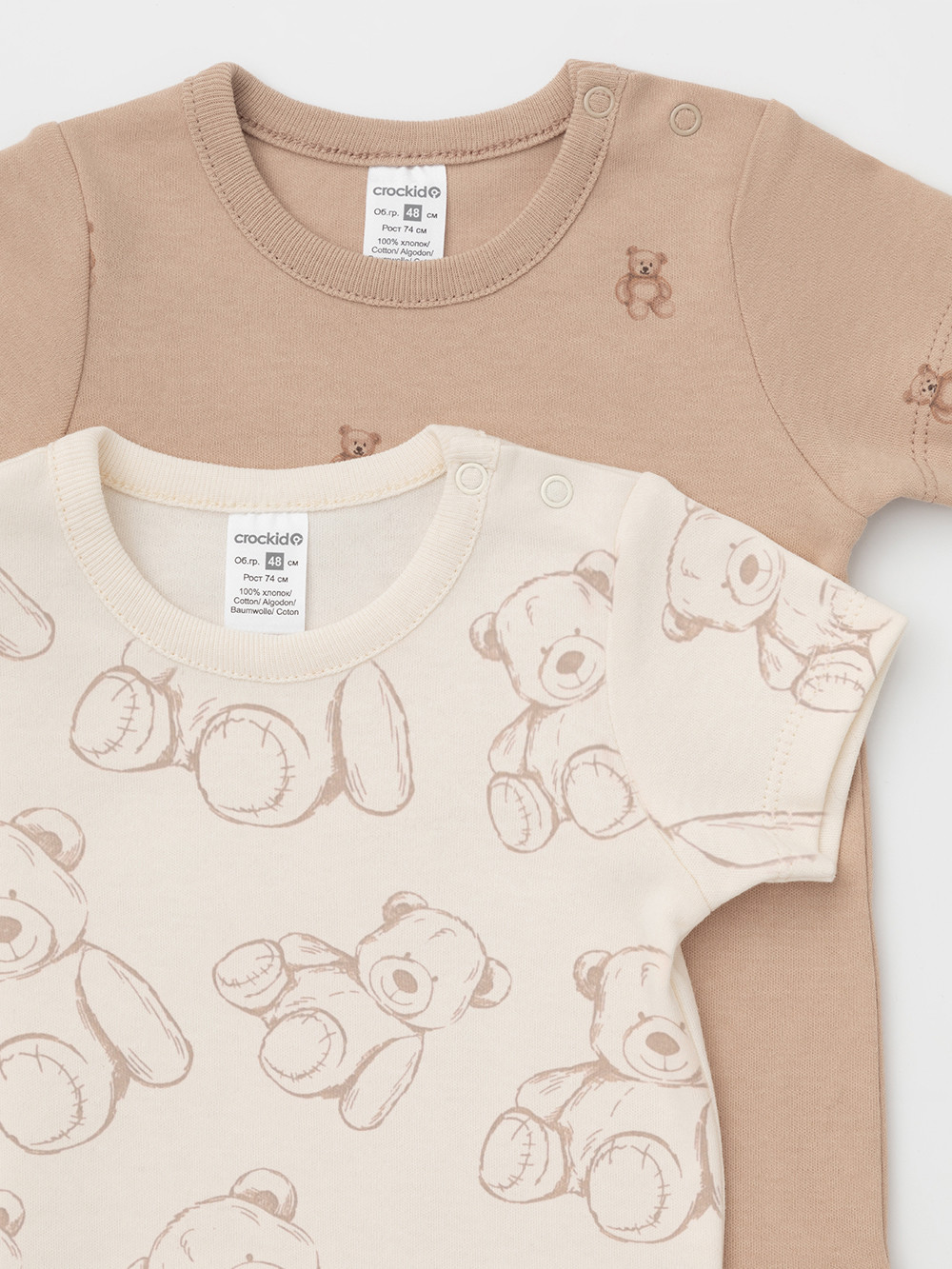 Боди для новорождённых из мягкого эластичного трикотажа, произведённого из натурального хлопка. В упаковке 2 штуки. Застёгиваются на кнопки на плече и по низу изделий. Оригинальная набивка и принт выполнены из стойких гипоаллергенных текстильных красителей. Все трикотажные полотна производятся в соответствии с нормами швейцарского сертификата ЭкоТекс.