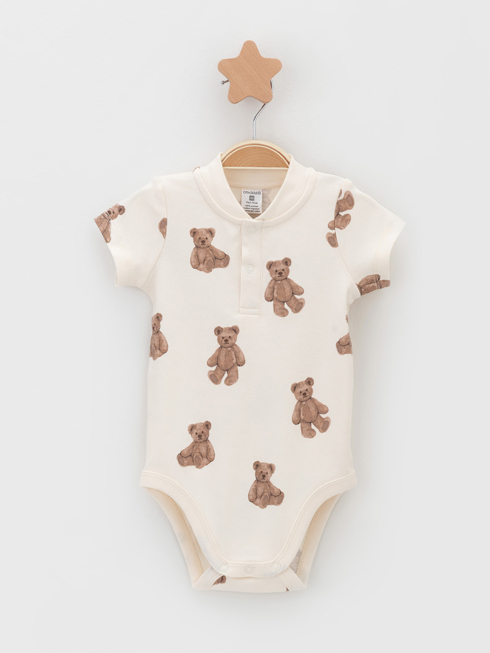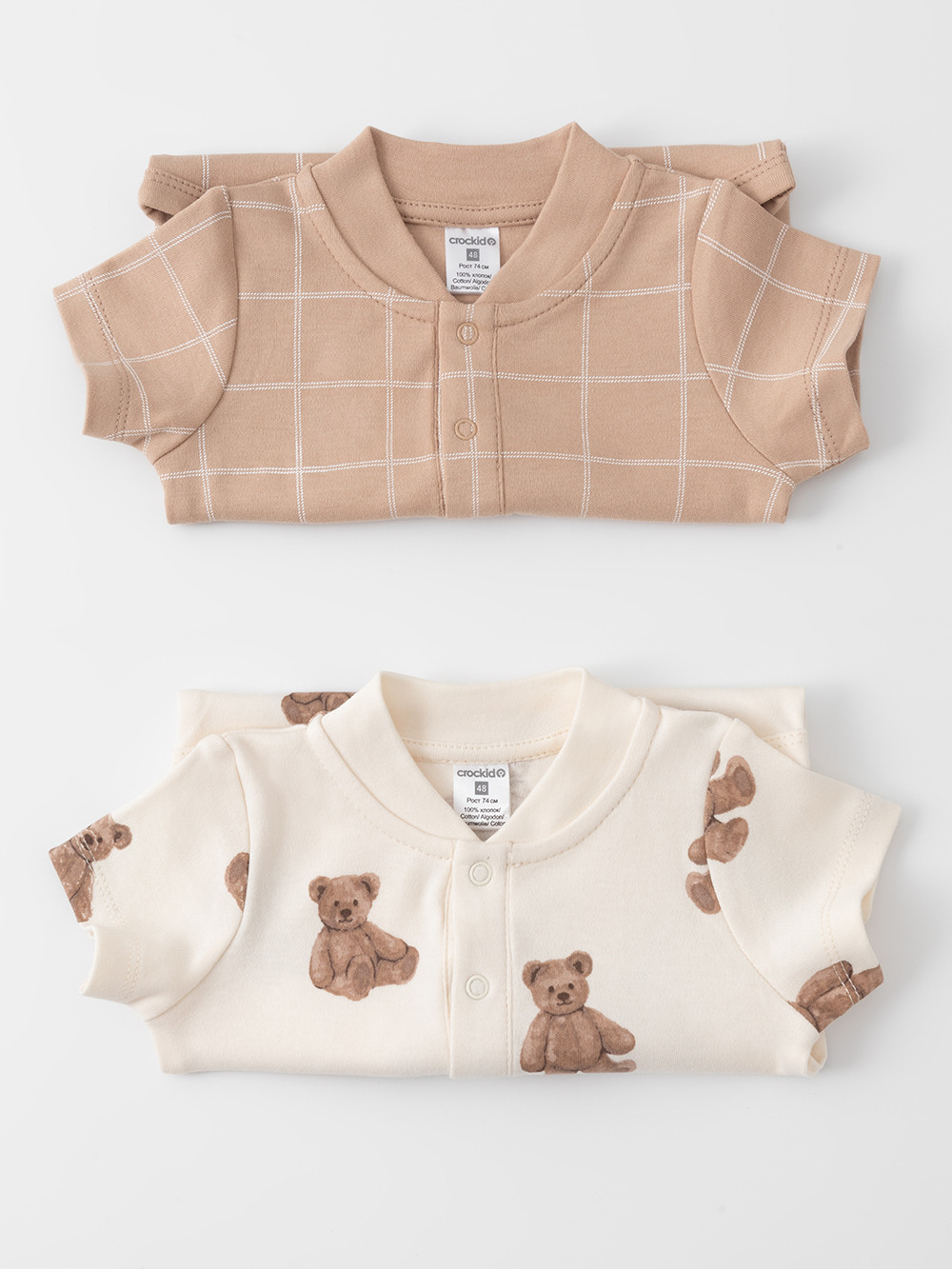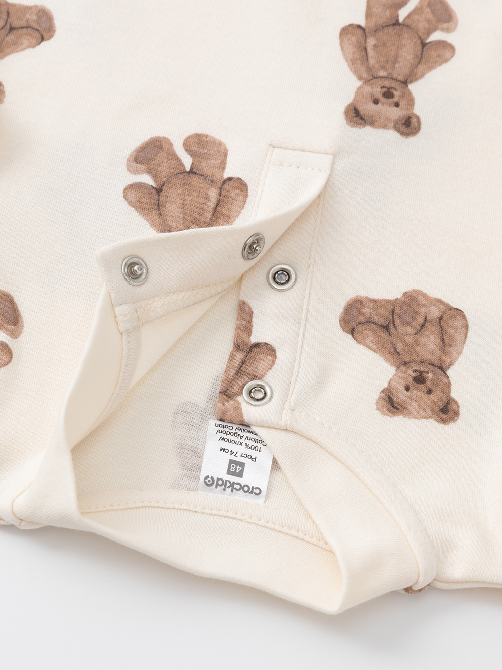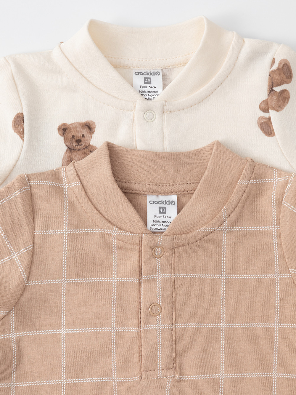 Боди для новорождённых из мягкого эластичного трикотажа, произведённого из натурального хлопка. В упаковке 2 штуки. Застёгиваются на кнопки спереди и по низу изделий. Оригинальная набивка выполнена из стойких гипоаллергенных текстильных красителей. Все трикотажные полотна производятся в соответствии с нормами швейцарского сертификата ЭкоТекс.