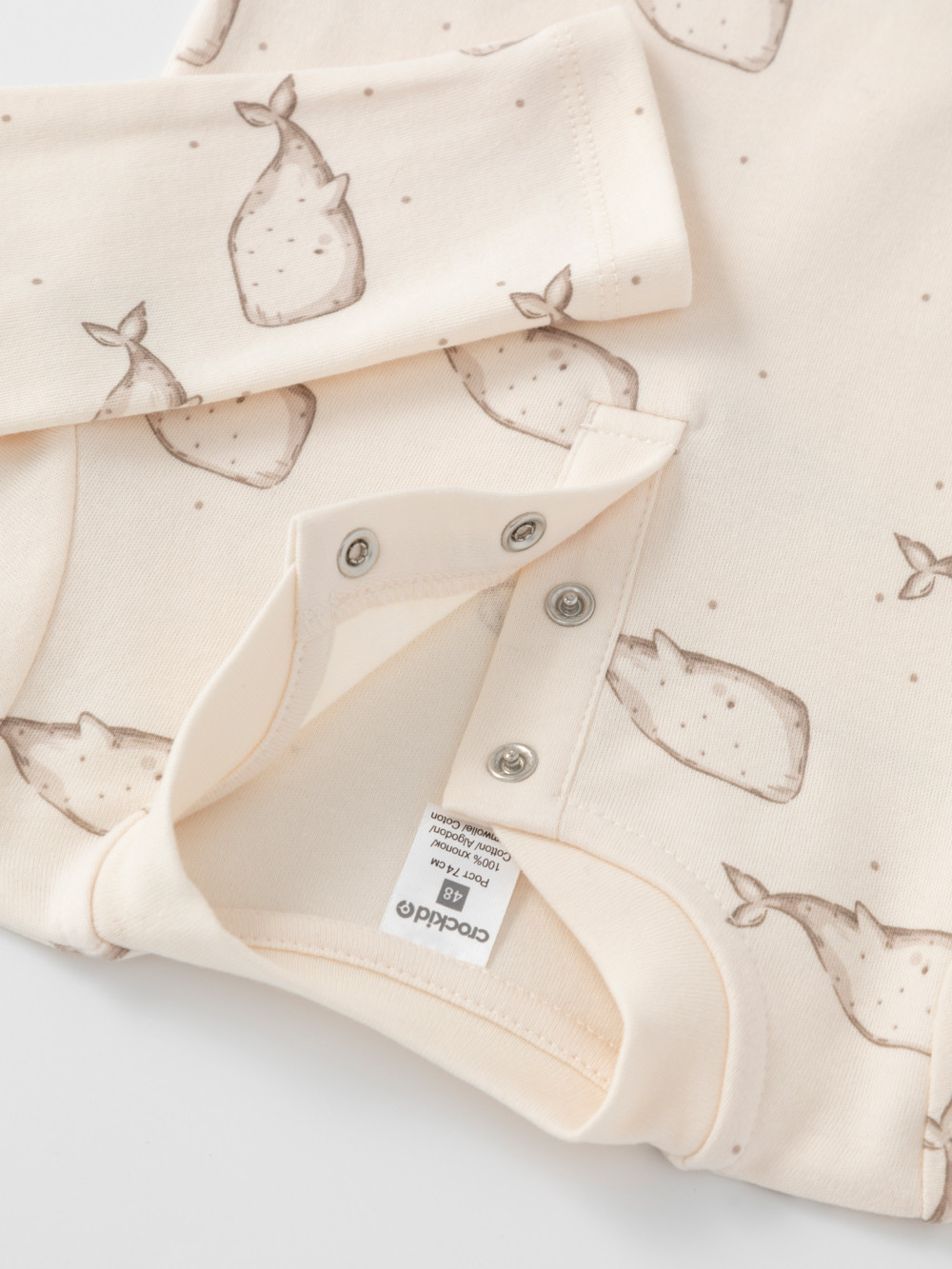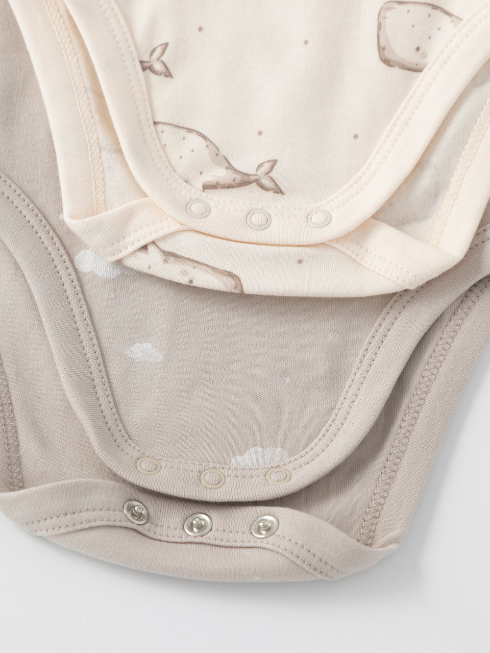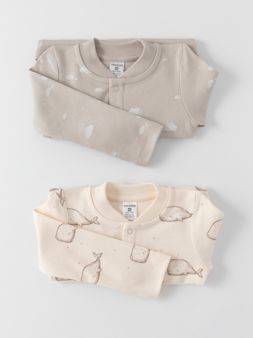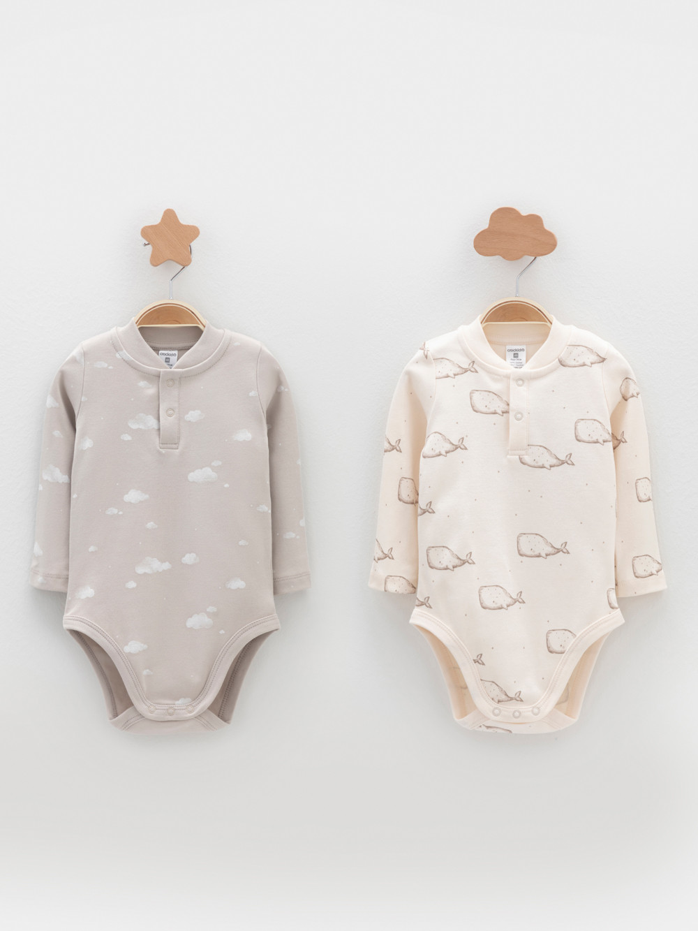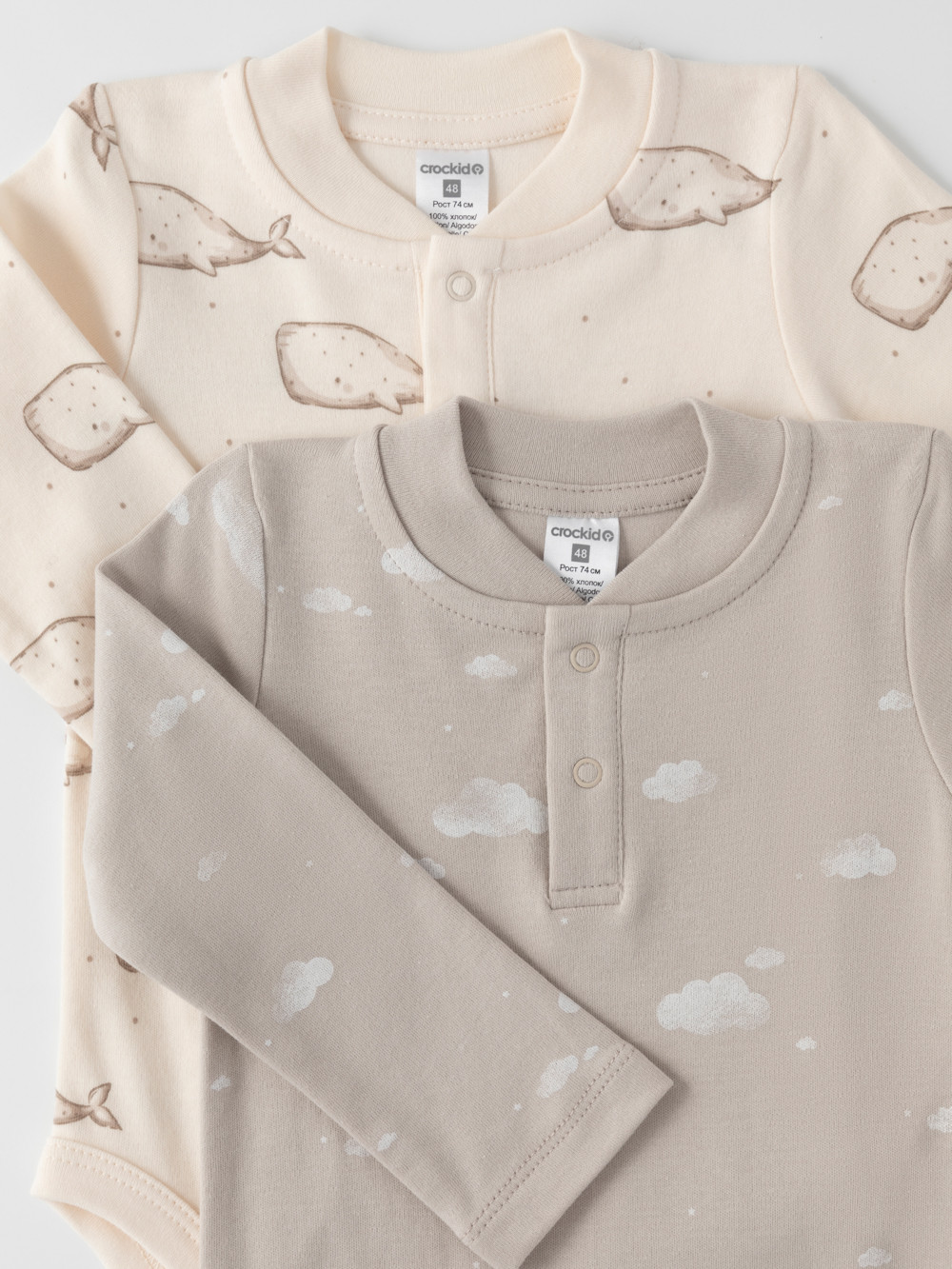 Боди для новорождённых из мягкого эластичного трикотажа, произведённого из натурального хлопка. В упаковке 2 штуки. Застёгиваются на кнопки спереди и по низу изделий. Оригинальная набивка выполнена из стойких гипоаллергенных текстильных красителей. Все трикотажные полотна производятся в соответствии с нормами швейцарского сертификата ЭкоТекс.