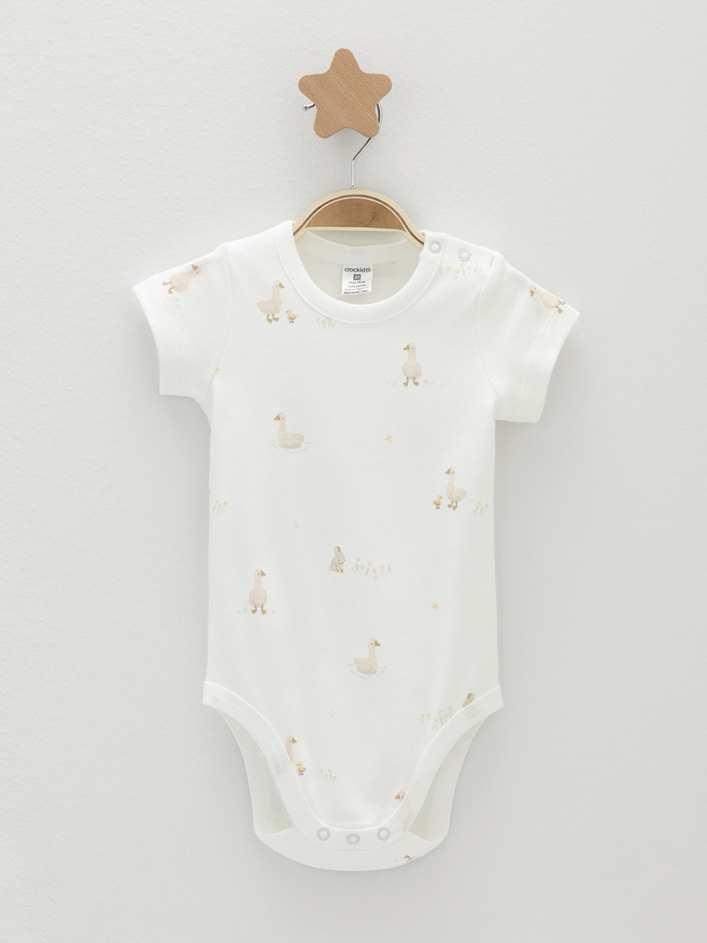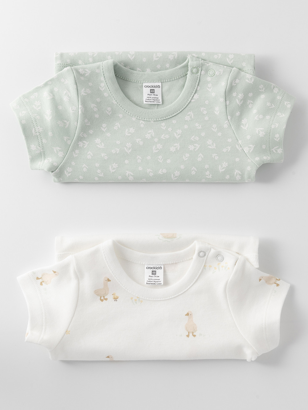 Боди для новорождённых из мягкого эластичного трикотажа, произведённого из натурального хлопка. В упаковке 2 штуки. Застёгиваются на кнопки на плече и по низу изделий. Оригинальная набивка выполнена из стойких гипоаллергенных текстильных красителей. Все трикотажные полотна производятся в соответствии с нормами швейцарского сертификата ЭкоТекс.