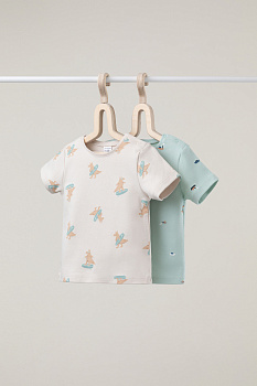 Футболки для мальчика из высококачественного трикотажа интерлок. В упаковке 2 штуки. Для удобства на плече застёжка на кнопки. Оригинальная набивка выполнена из стойких гипоаллергенных текстильных красителей. Все трикотажные полотна производятся в соответствии с нормами Швейцарского сертификата ЭкоТекс.