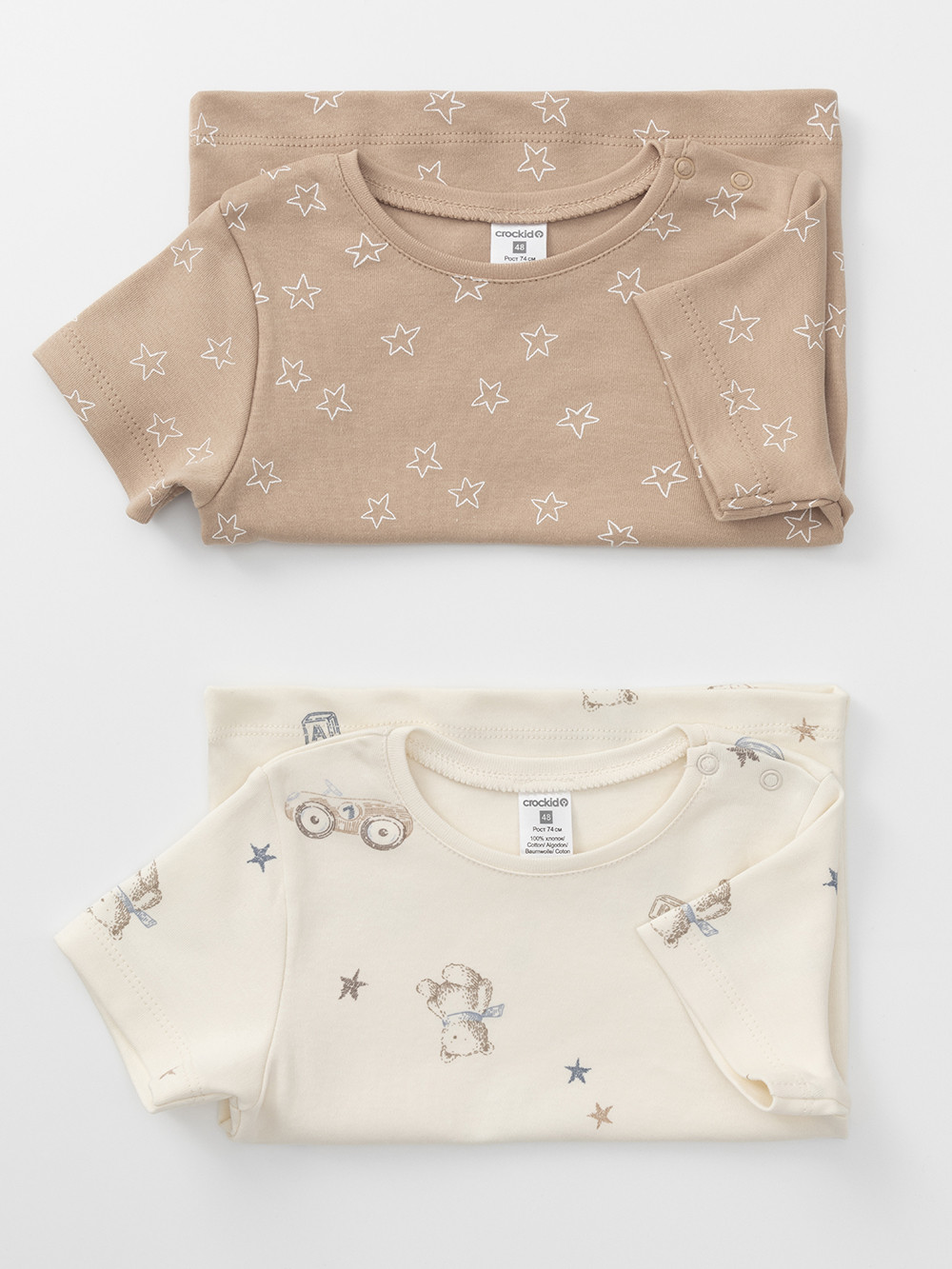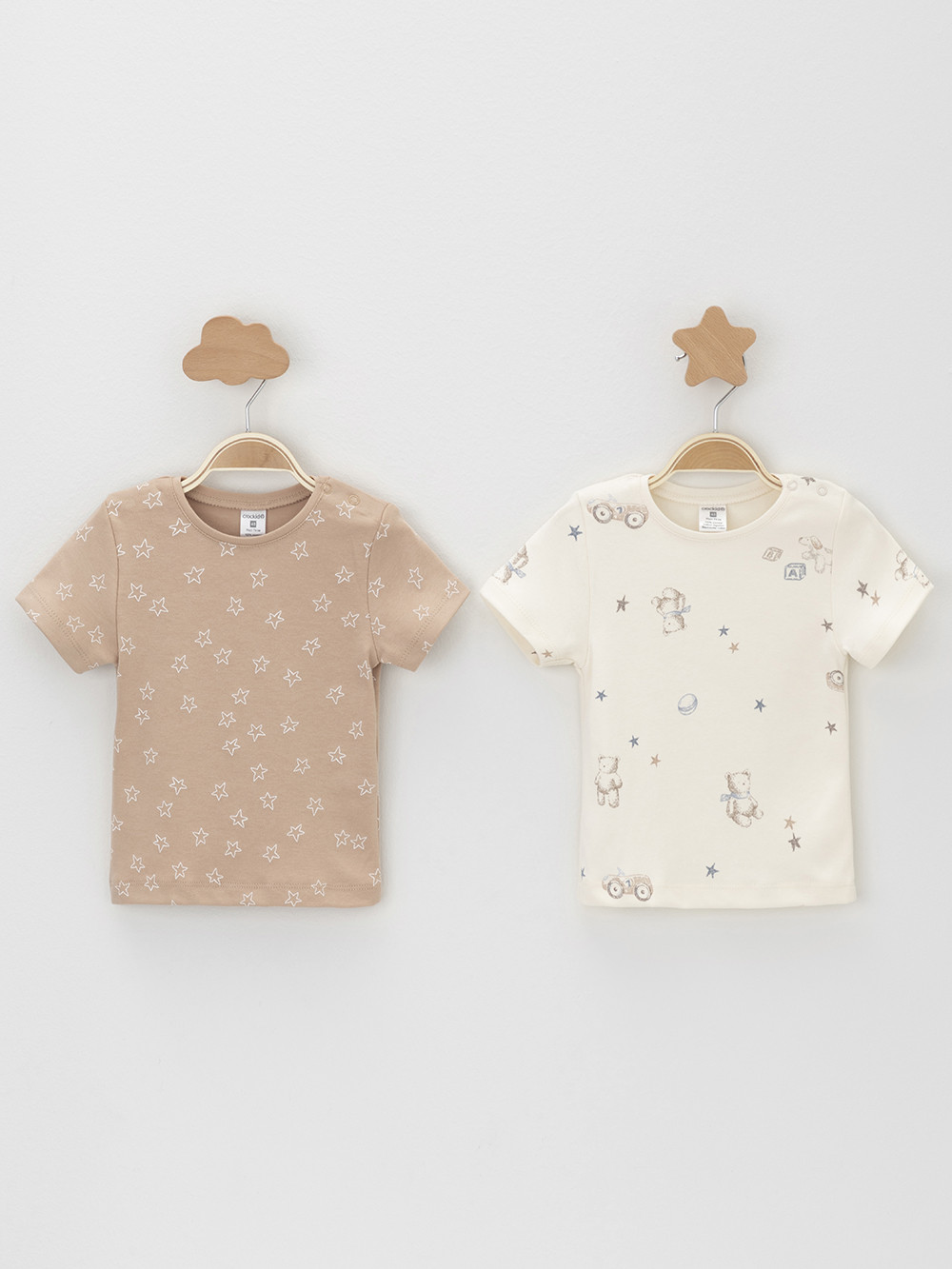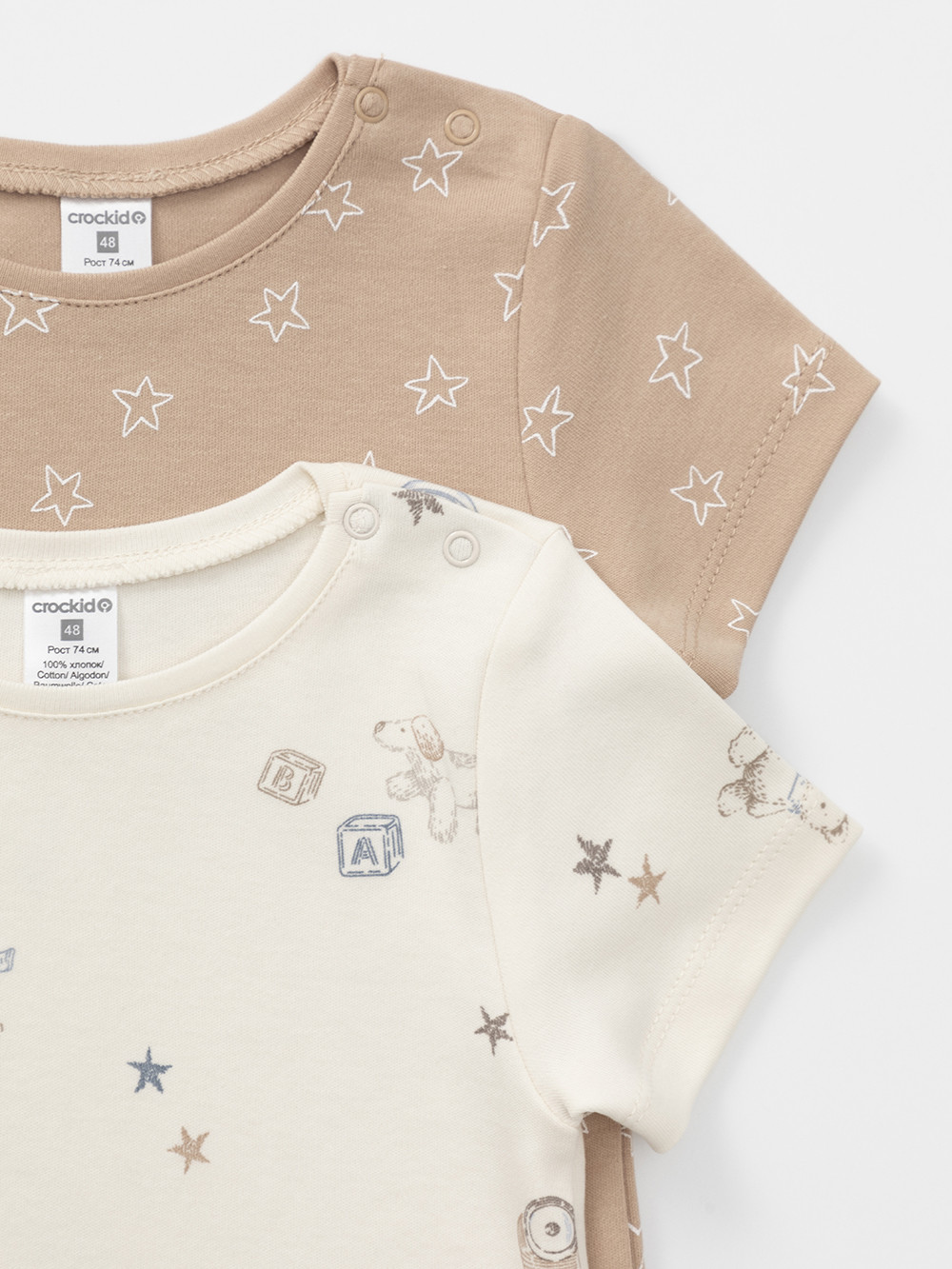 Футболки для мальчика из высококачественного трикотажа, произведённого из натурального хлопка. В упаковке 2 штуки. Для удобства на плече застёжка на кнопки. Оригинальная набивка выполнена из стойких гипоаллергенных текстильных красителей. Все трикотажные полотна производятся в соответствии с нормами швейцарского сертификата ЭкоТекс.