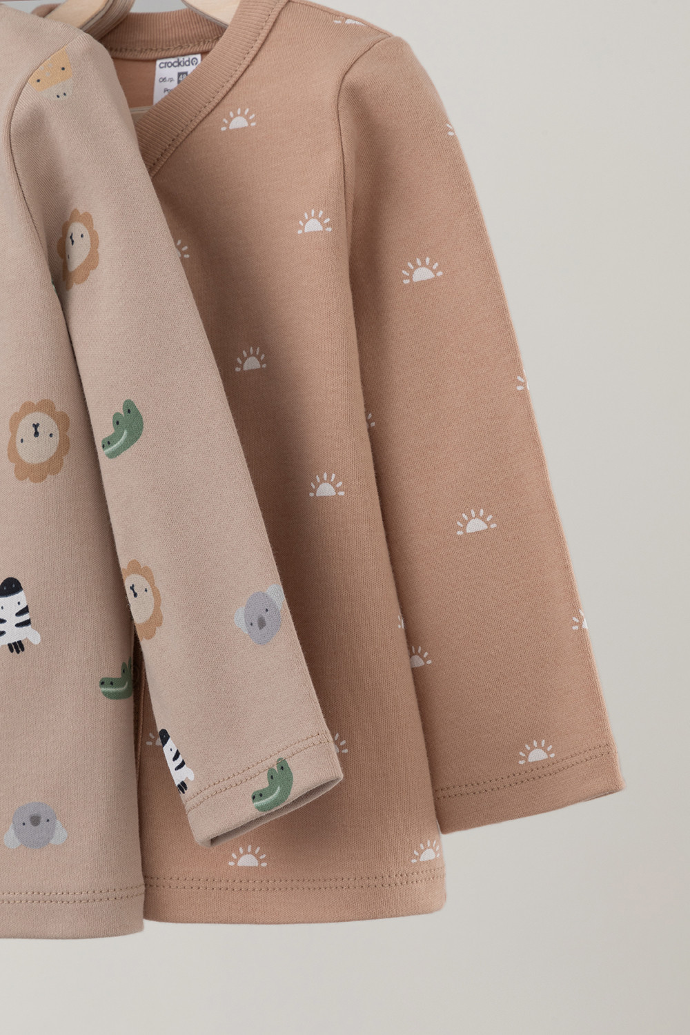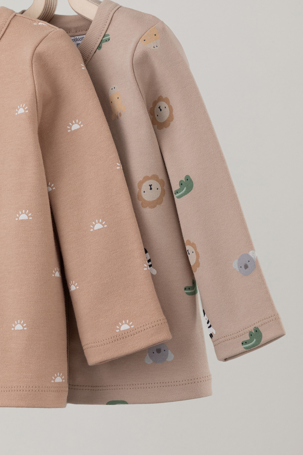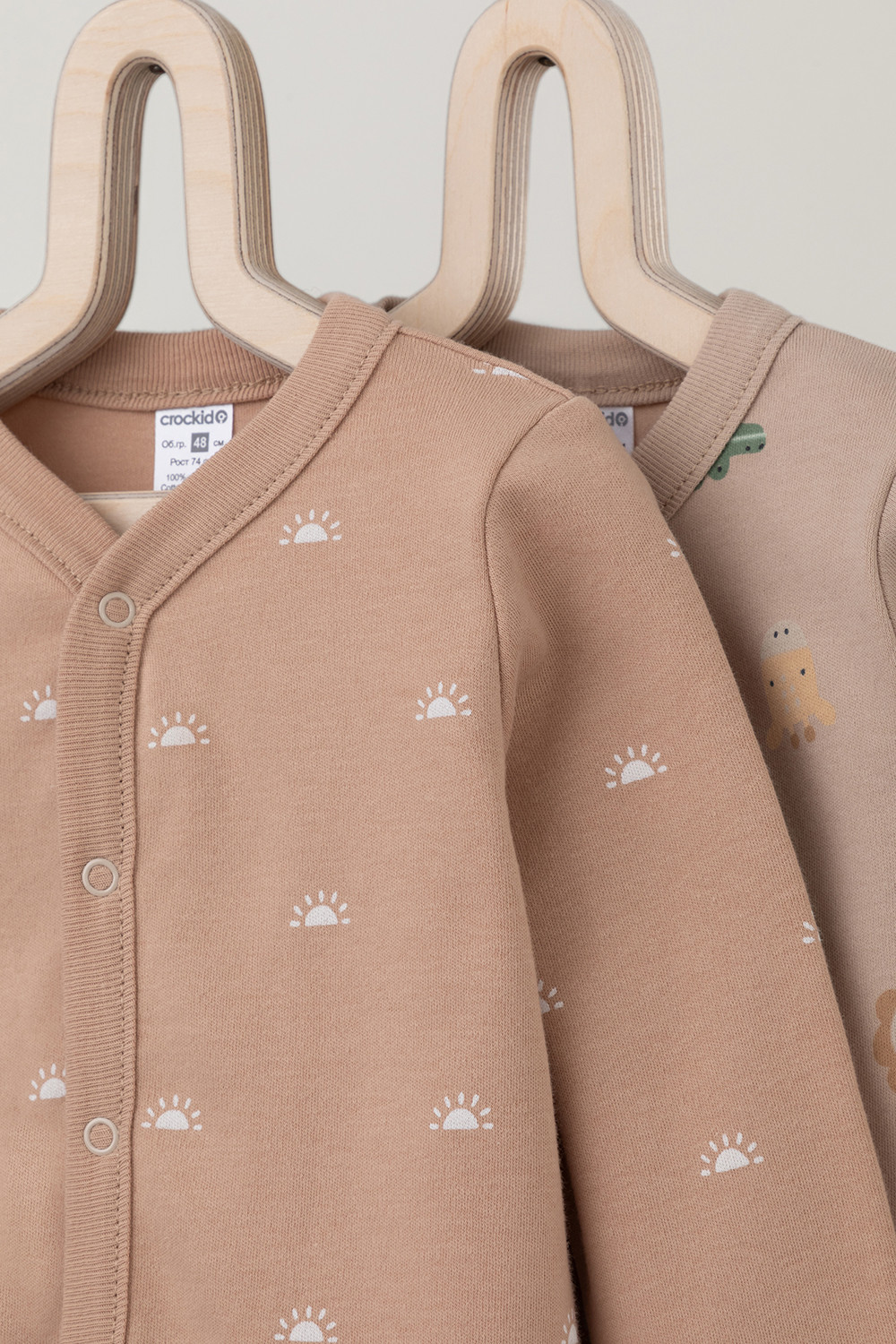 Кофточки для новорождённых из мягкого эластичного трикотажа интерлок, произведённого из натурального хлопка. В упаковке 2 штуки. Застёгиваются спереди на кнопки. В размере 56 на рукавах предусмотрены отвороты, швы выполнены наружу. Оригинальная набивка выполнена из стойких гипоаллергенных текстильных красителей. Все трикотажные полотна производятся в соответствии с нормами Швейцарского сертификата ЭкоТекс.