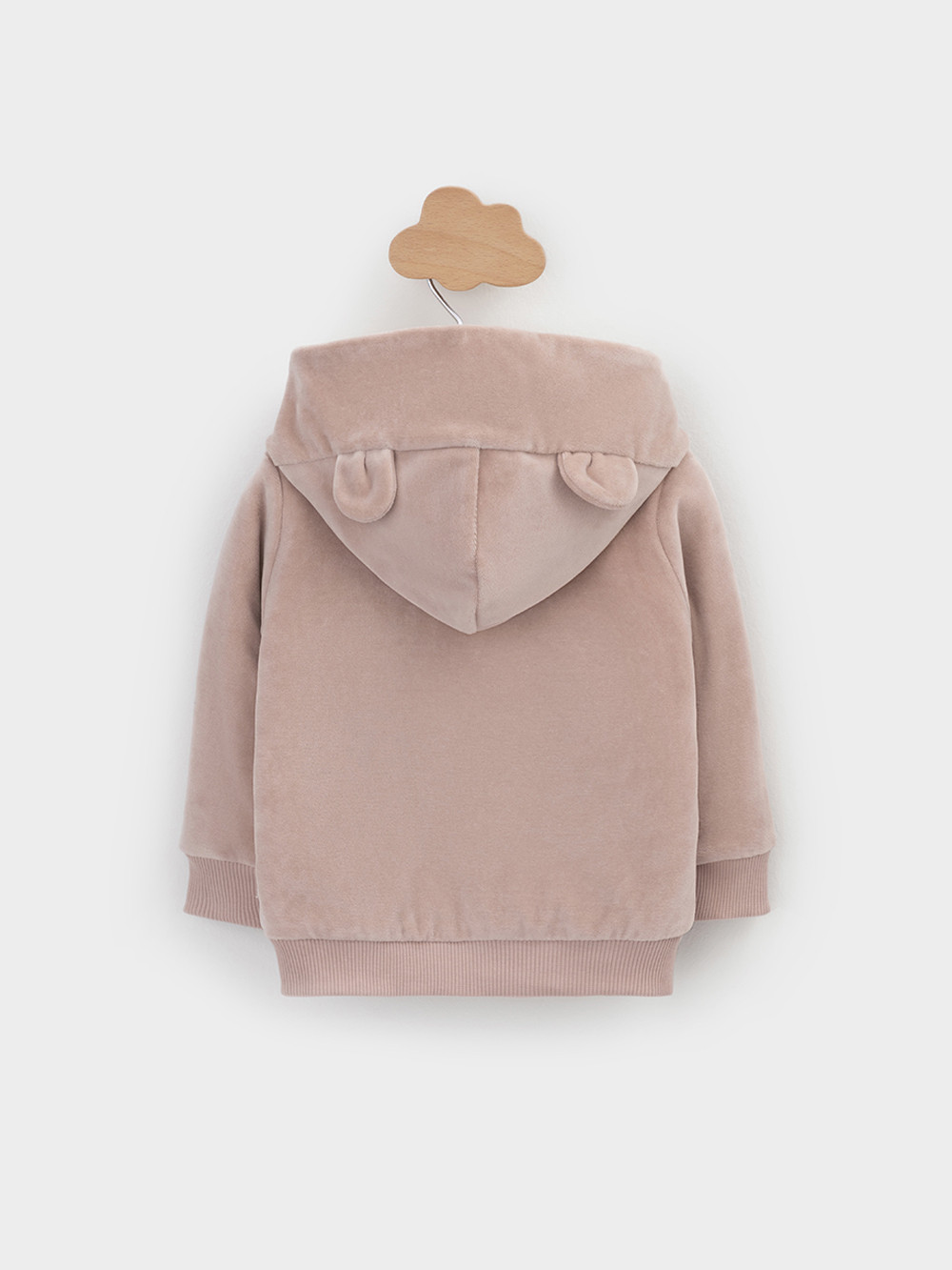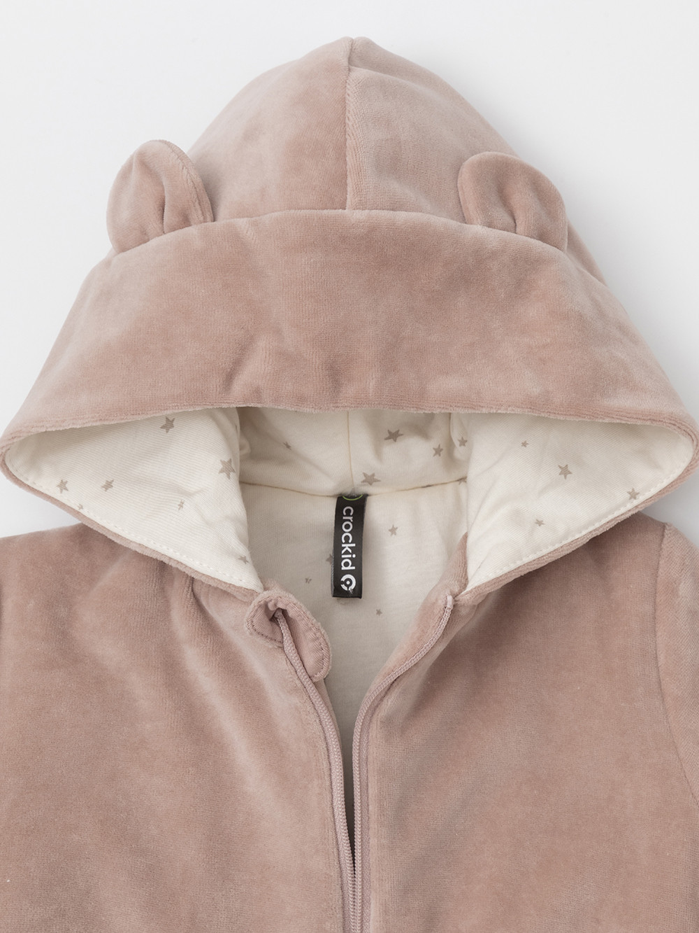 Тёплая куртка из велюра для новорождённых. Внутри синтепон и подклад из натурального хлопка. Изделие застёгивается на молнию и имеет капюшон. На рукавах мягкие манжеты, внизу - эластичный пояс. Спереди два накладных кармана и украшение в виде вышивки. Все трикотажные полотна производятся в соответствии с нормами Швейцарского сертификата ЭкоТекс.