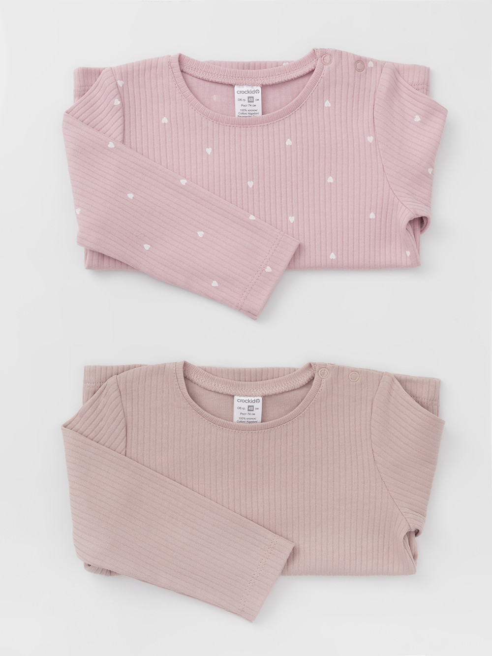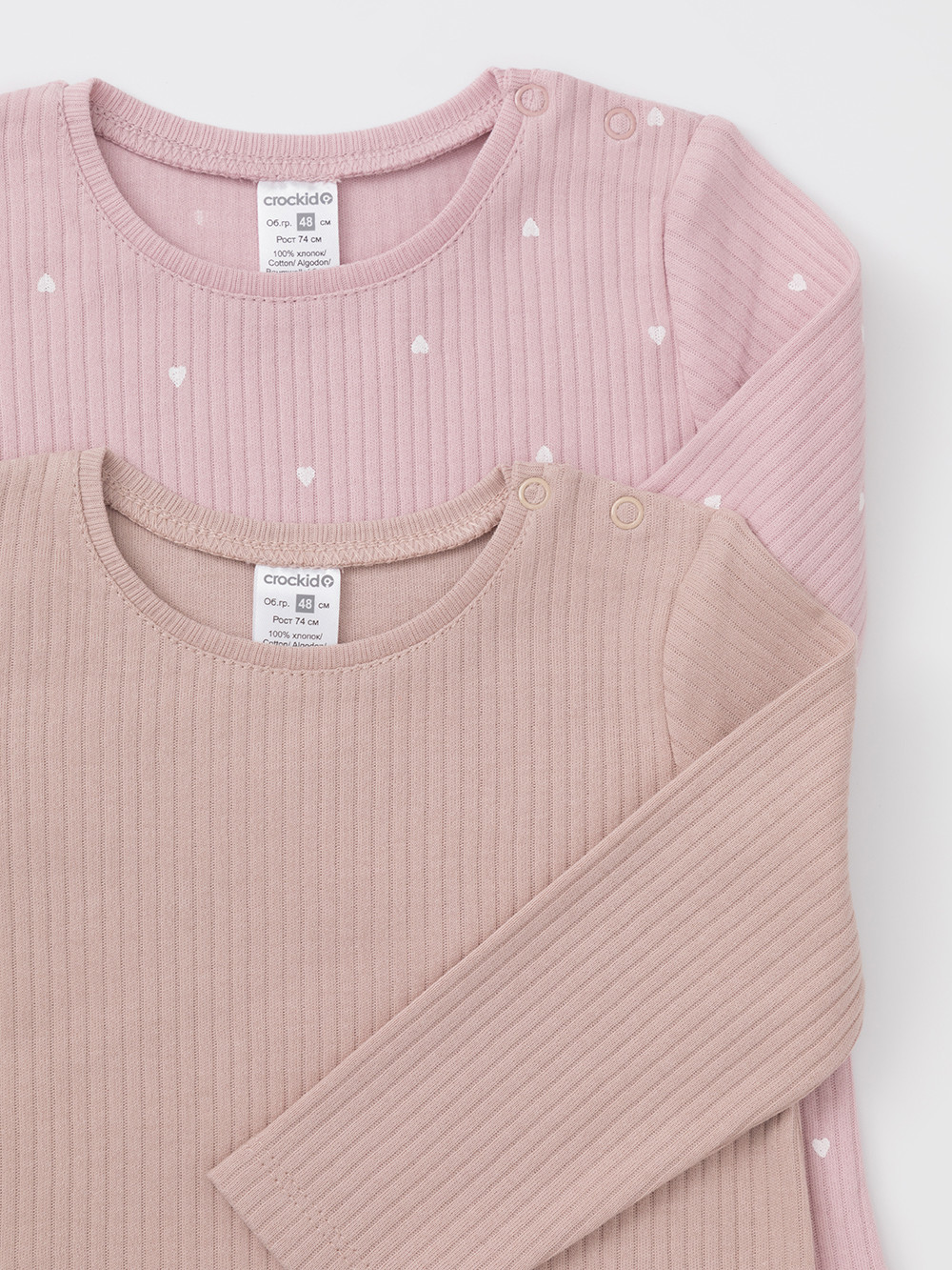 Джемперы лонгсливы для новорождённых из мягкого эластичного трикотажа, произведённого из натурального хлопка. В упаковке 2 штуки. Застёгиваются на плече на кнопки. Все трикотажные полотна производятся в соответствии с нормами швейцарского сертификата ЭкоТекс.