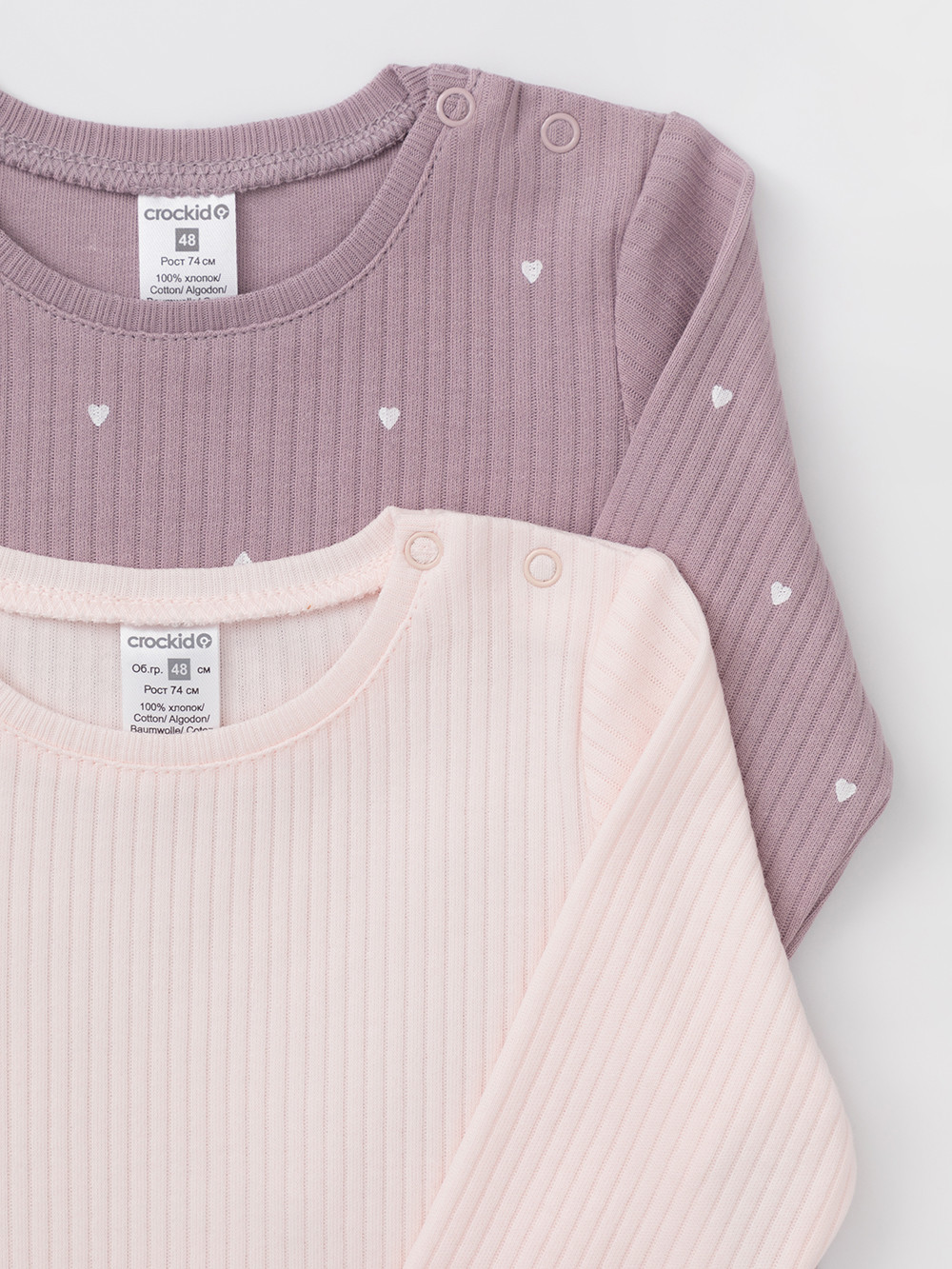 Джемперы лонгсливы для новорождённых из мягкого эластичного трикотажа, произведённого из натурального хлопка. В упаковке 2 штуки. Застёгиваются на плече на кнопки. Все трикотажные полотна производятся в соответствии с нормами швейцарского сертификата ЭкоТекс.