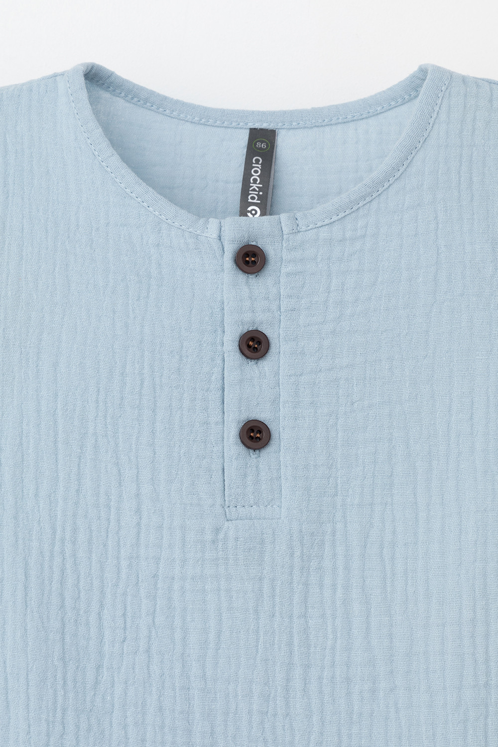 Легкий песочник для мальчика из мягкого хлопокового муслина с застежкой на пуговицы. Изделие сохраняет цвет, форму и фактуру жатости после многократных стирок.