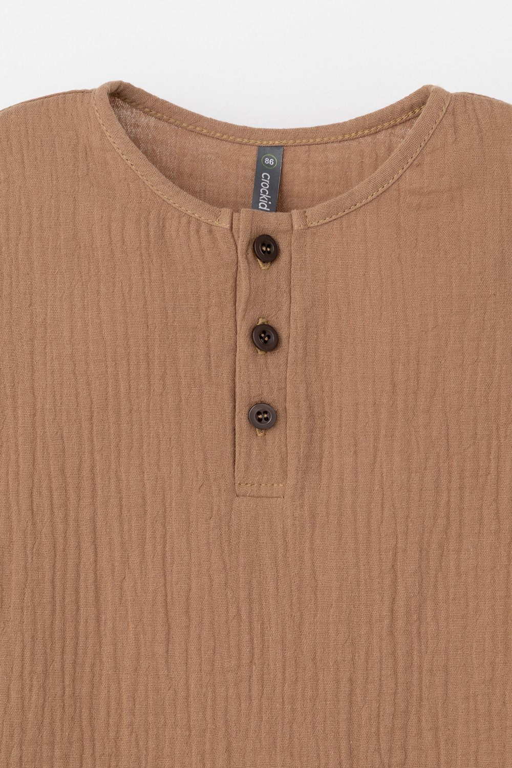 Легкий песочник для мальчика из мягкого хлопокового муслина с застежкой на пуговицы. Изделие сохраняет цвет, форму и фактуру жатости после многократных стирок.