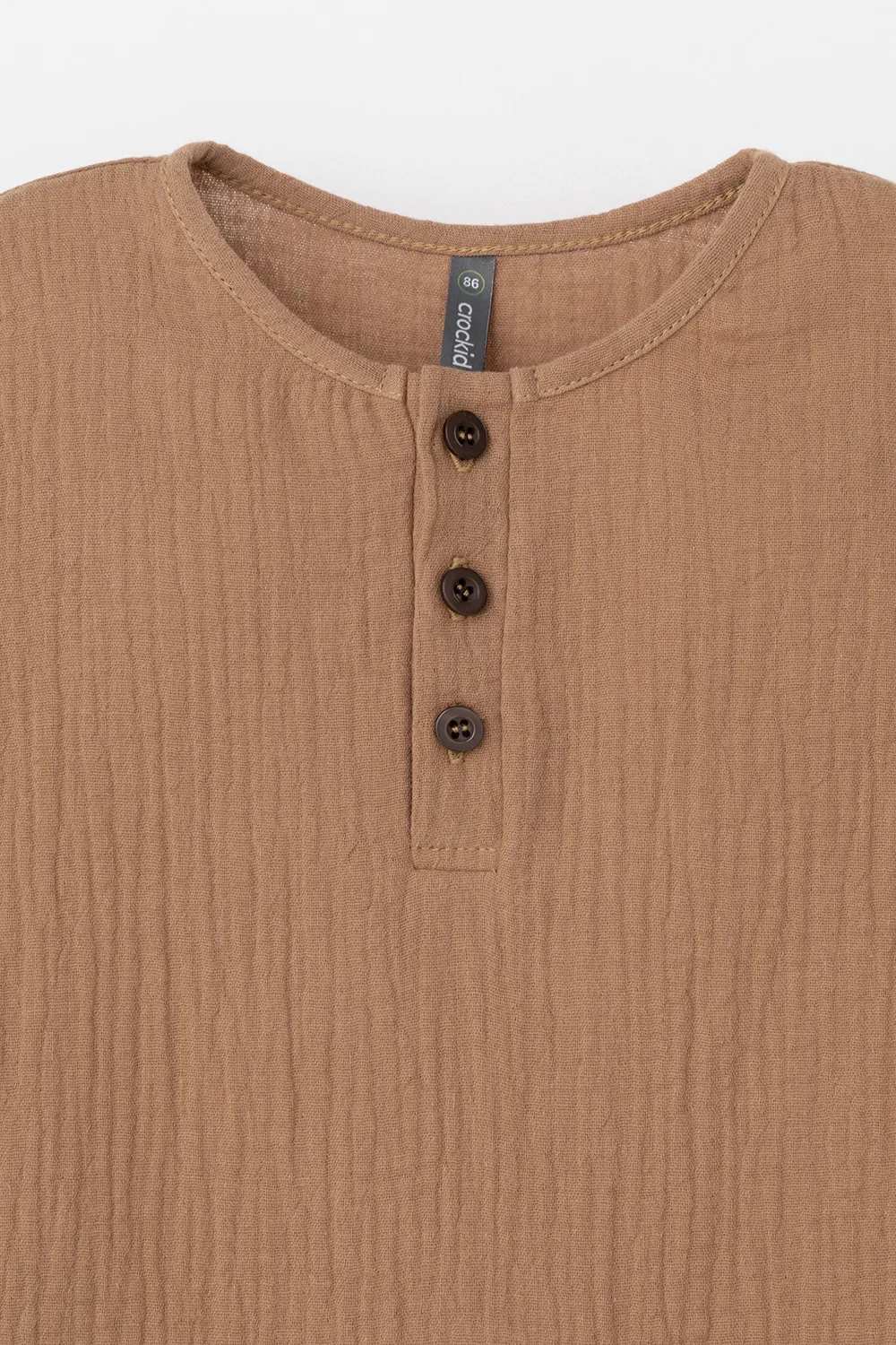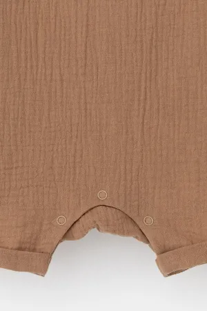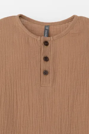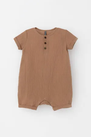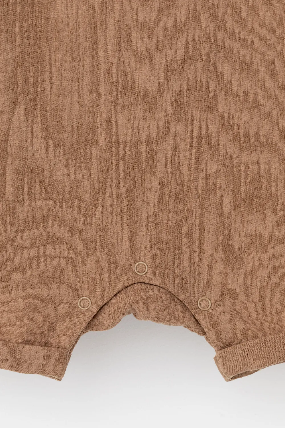 Легкий песочник для мальчика из мягкого хлопокового муслина с застежкой на пуговицы. Изделие сохраняет цвет, форму и фактуру жатости после многократных стирок.