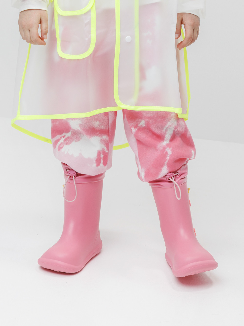 Лёгкие резиновые сапоги изготовлены из прочного материала ЭВА. Подошва не скользит и устойчива к истиранию. Сверху сапожки имеют влагозащитные манжеты, которые затягиваются на шнурок с фиксатором и предотвращают попадание воды и брызг внутрь обуви. Стелька в размерах 24 и 25,5 состоит