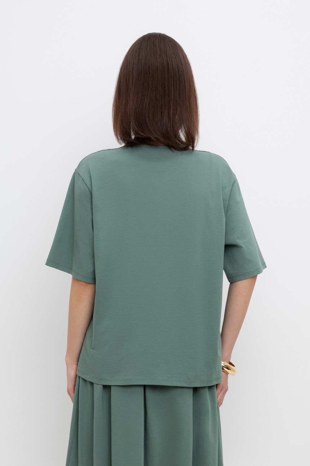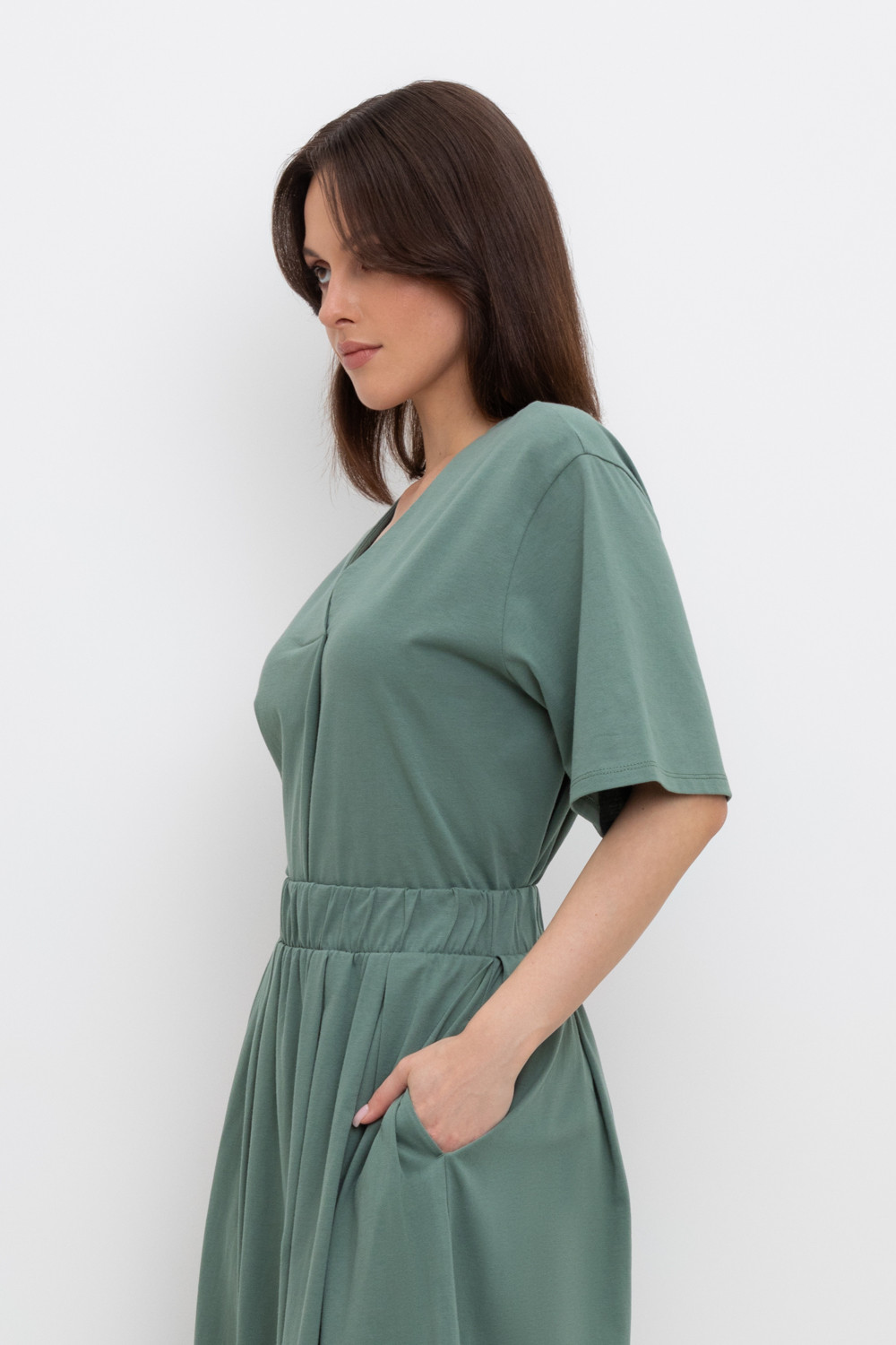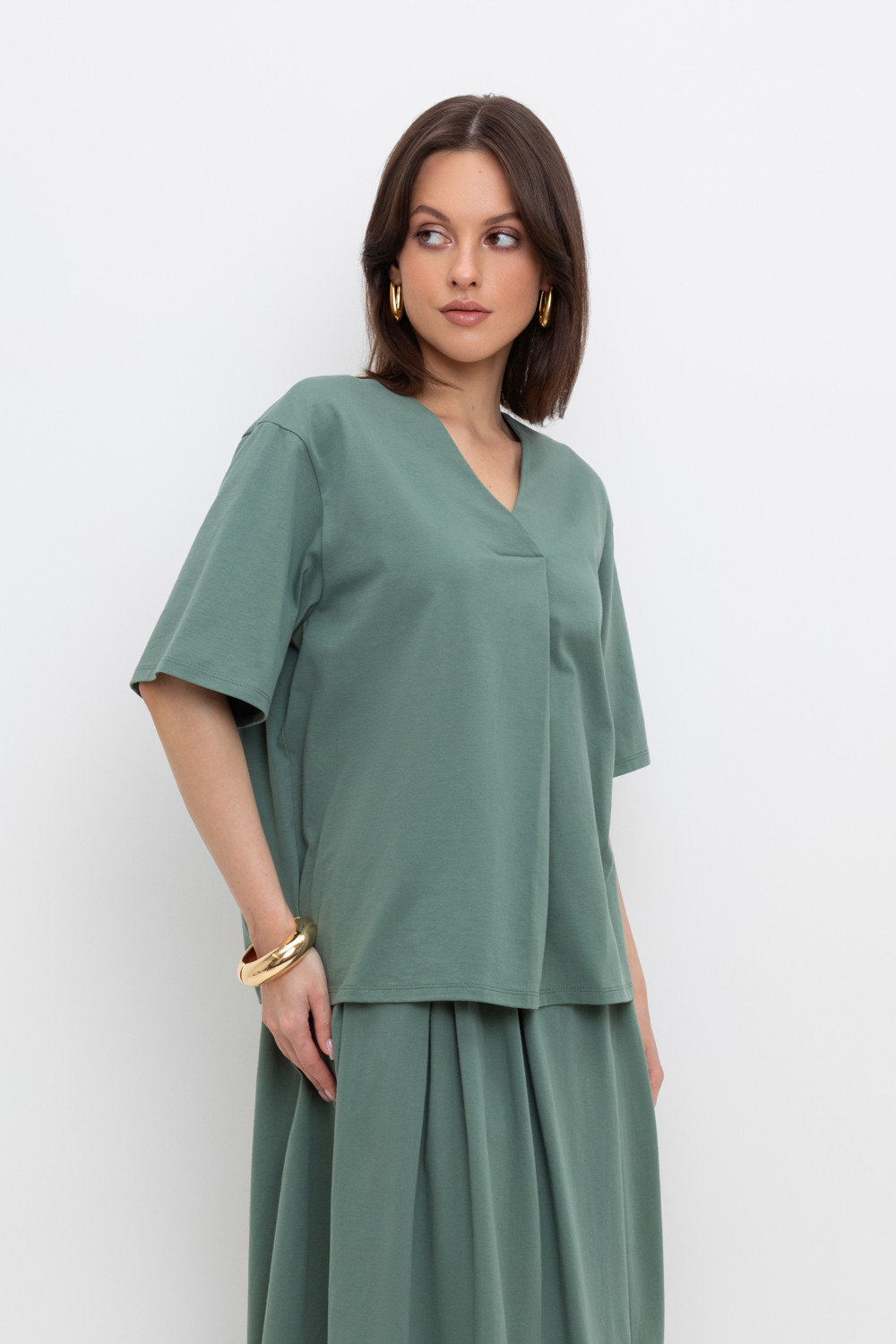 Легкая свободная блуза с короткими рукавами из длинноволокнистого гребенного хлопка. По полочке декоративная складка с эффектом запаха.