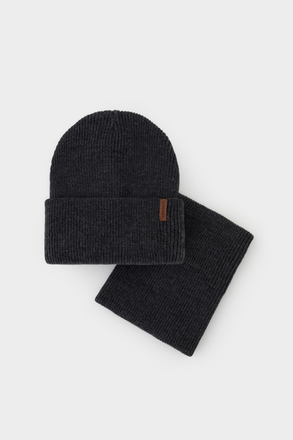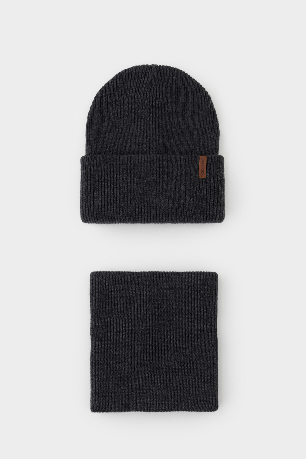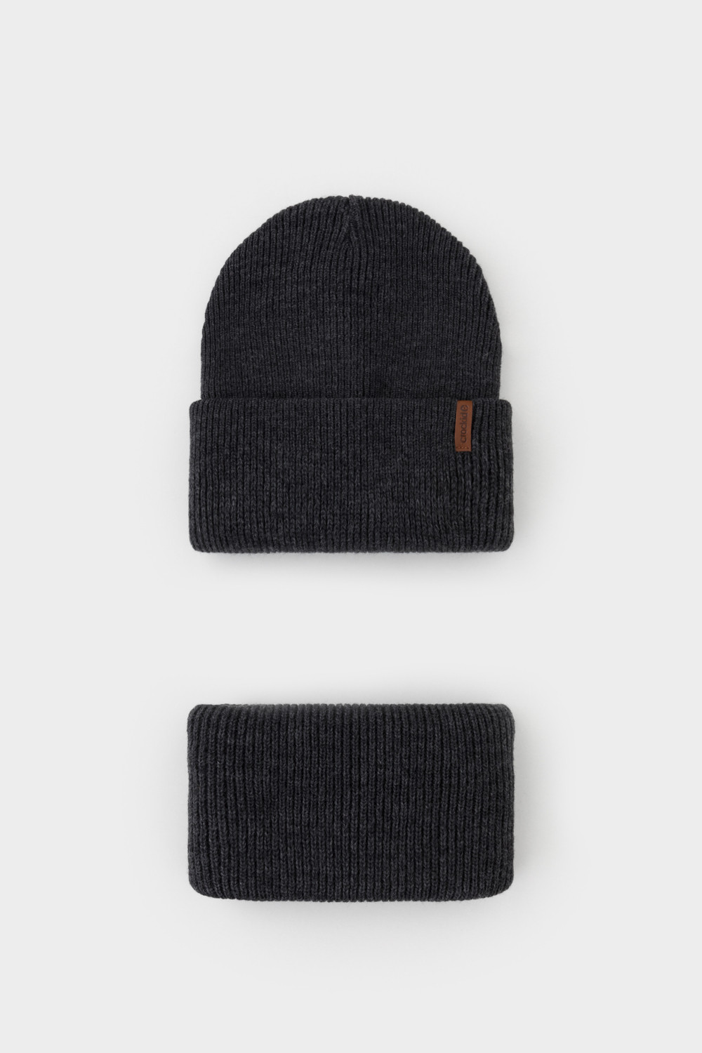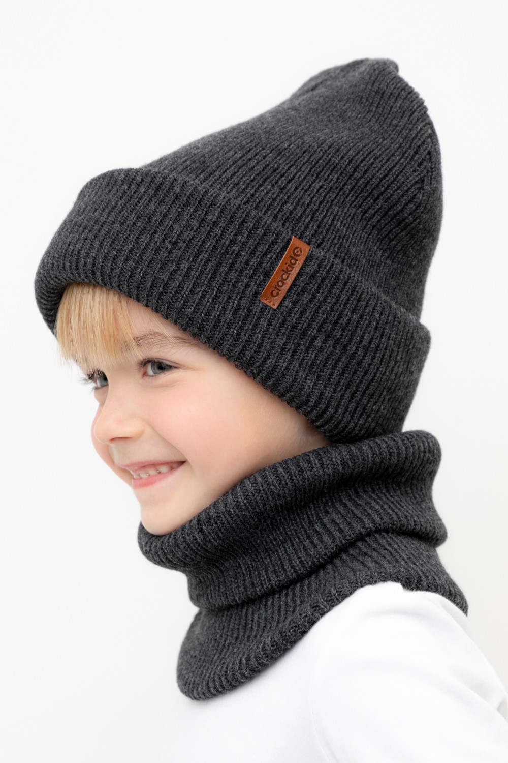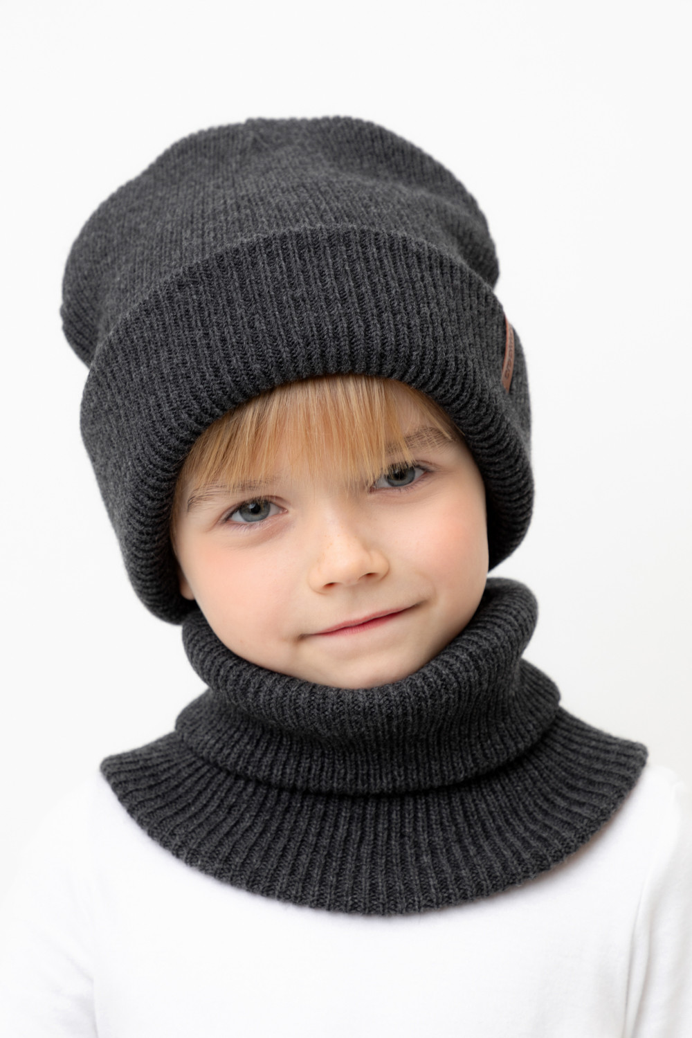 Комплект детский: шапка и снуд из полушерсти. Тёплая шапка с отворотом, украшена нашивкой из искусственной кожи. Снуд без оборотов вокруг шеи. Изделие сохраняет форму и стойкий цвет после многочисленных стирок.