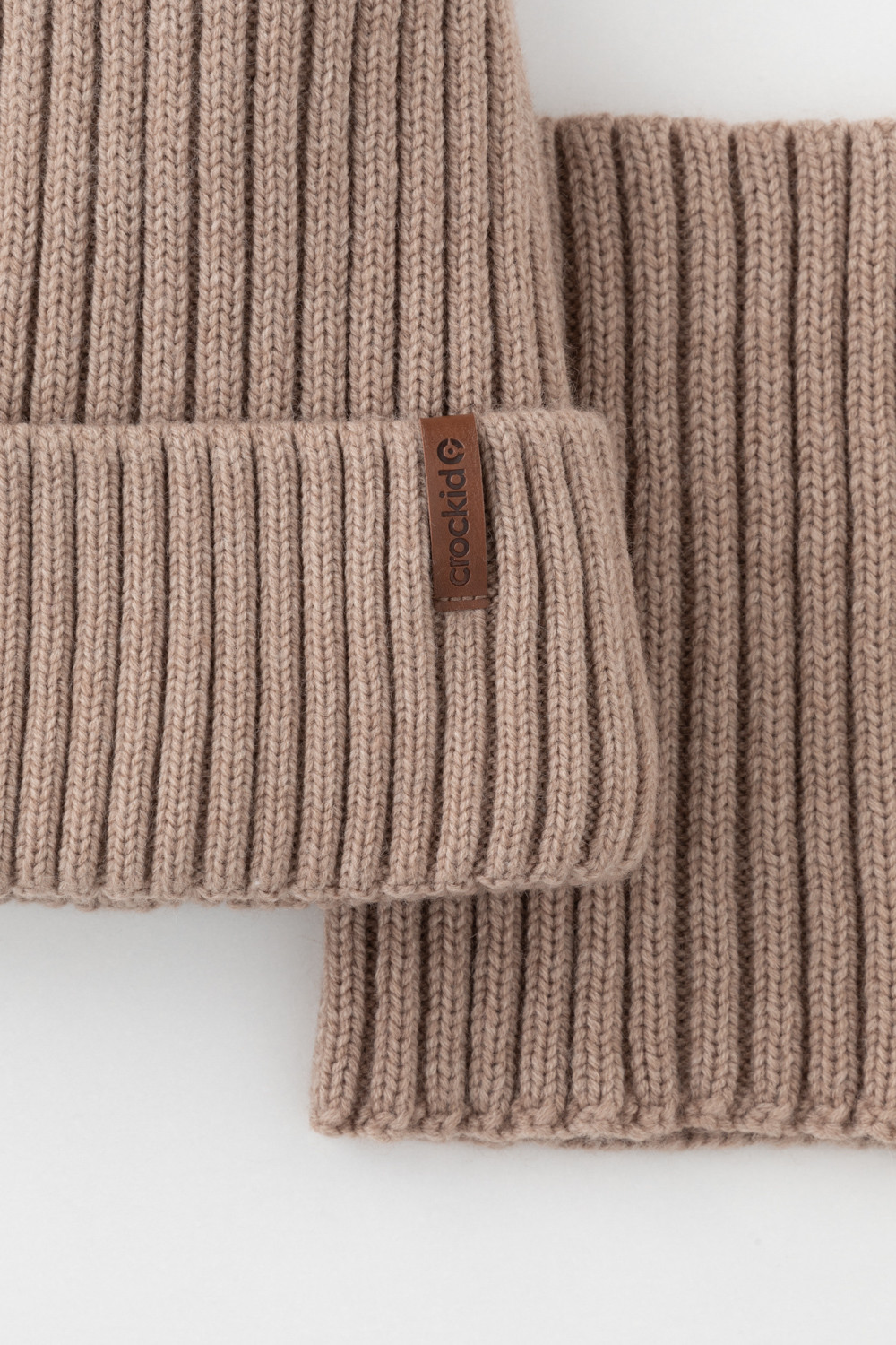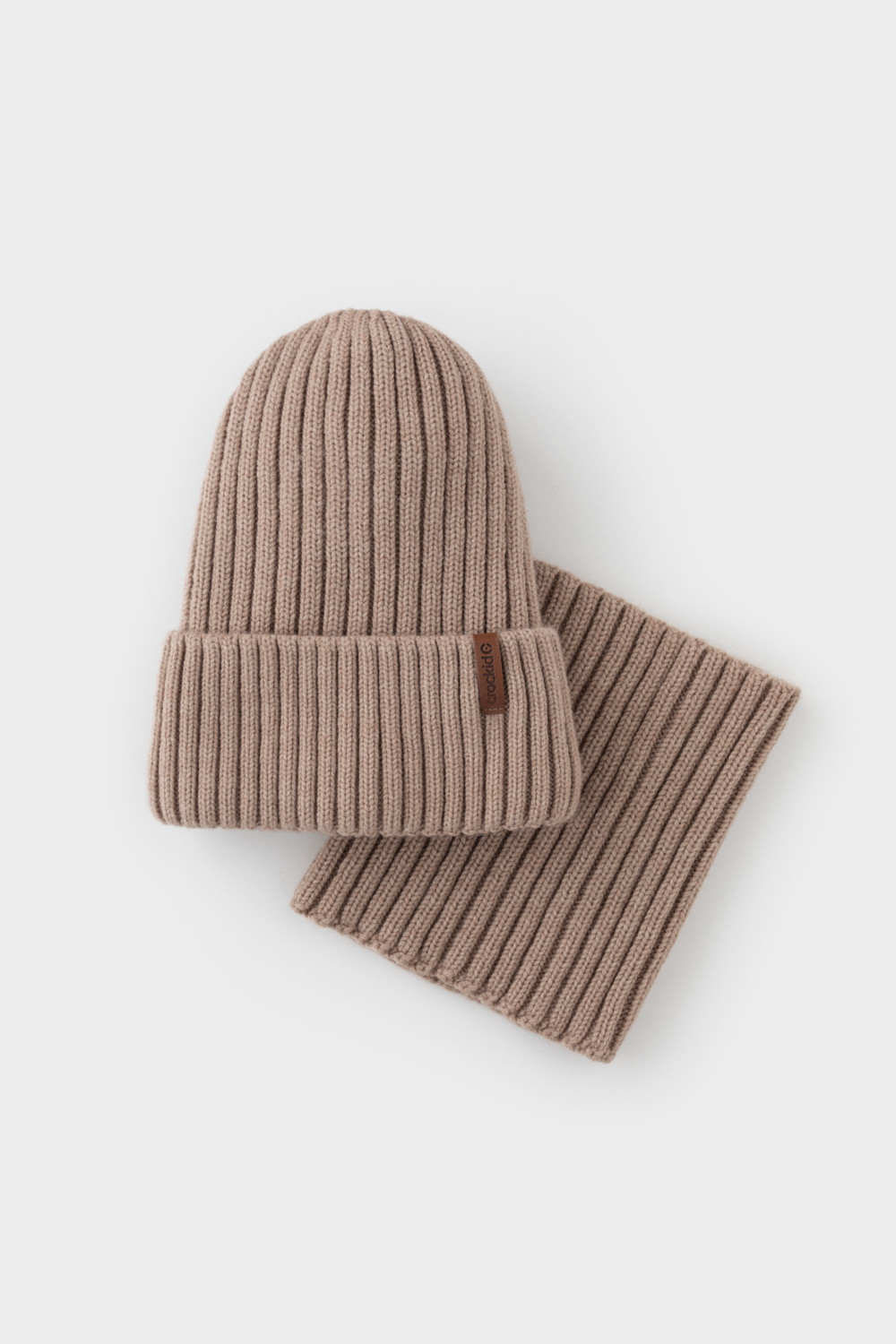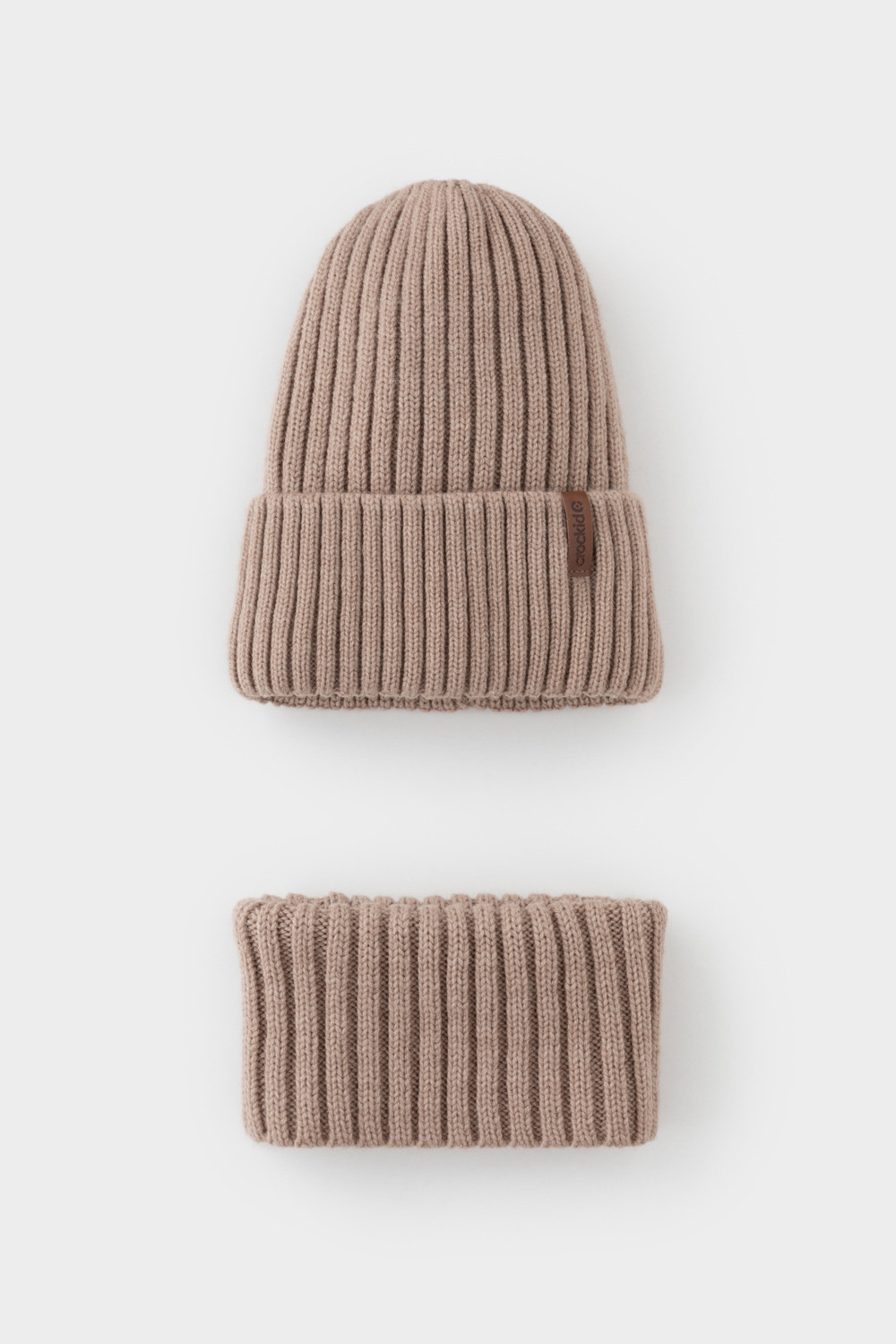 Комплект детский: шапка и снуд из полушерсти. Тёплая вязаная шапка с отворотом на подкладе из флиса. Украшена нашивкой из искусственной кожи. Узкий снуд без оборотов вокруг шеи. Изделие сохраняет форму и стойкий цвет после многочисленных стирок.